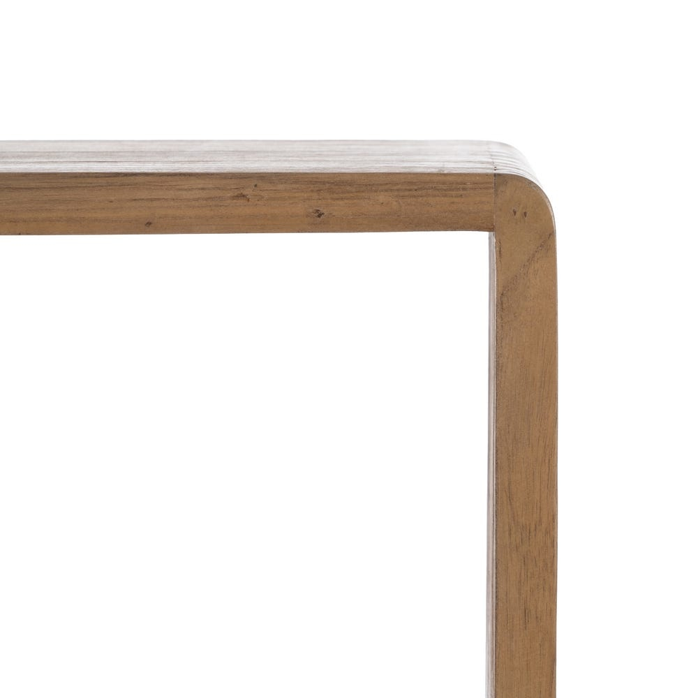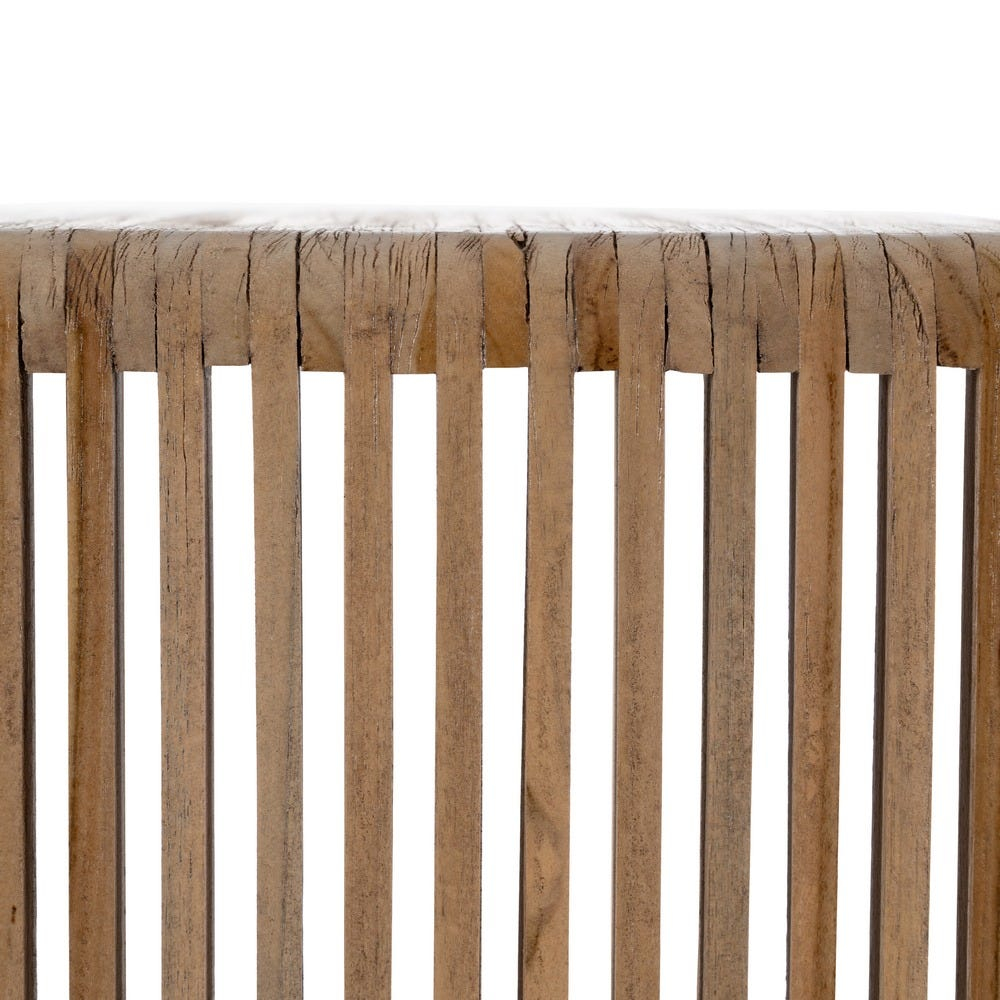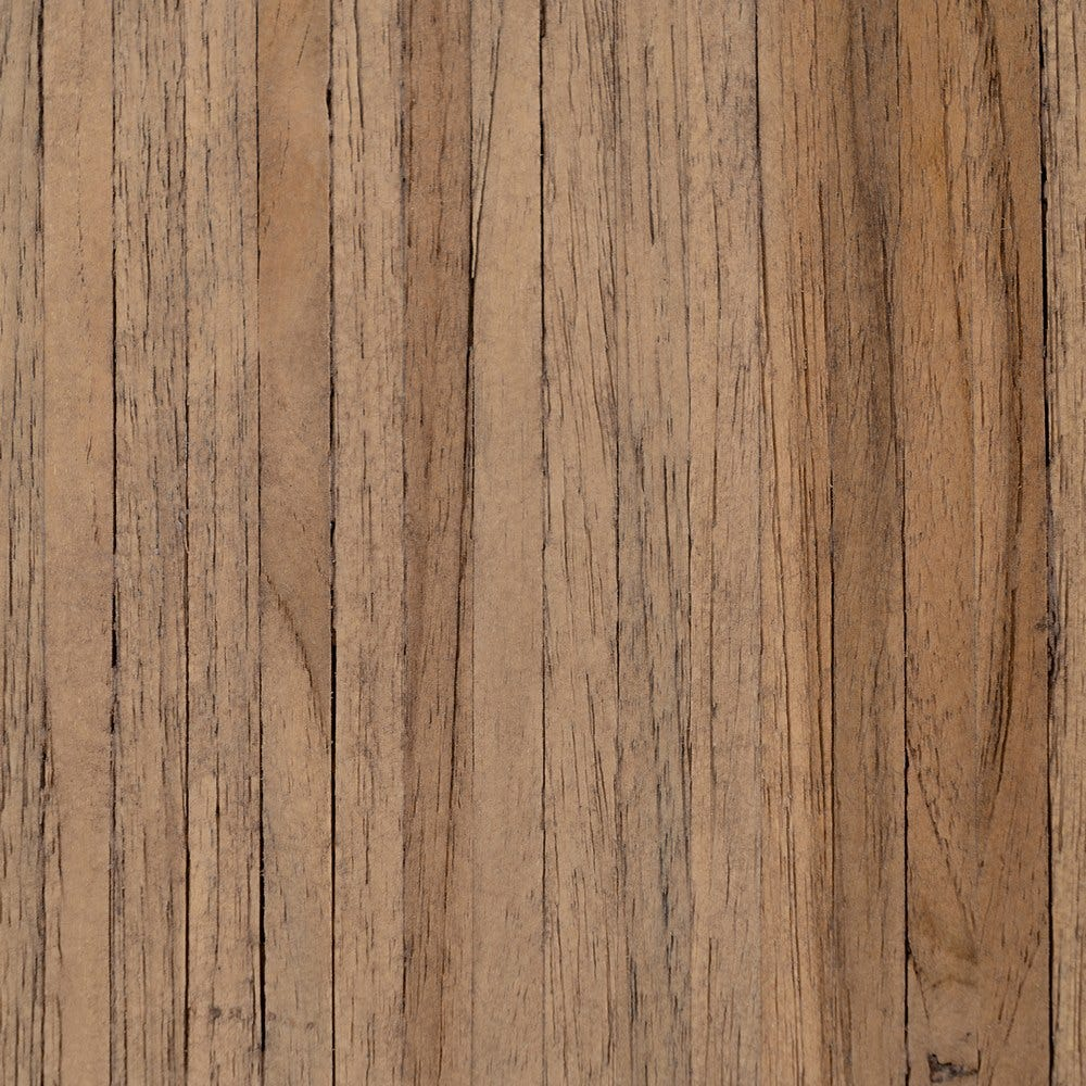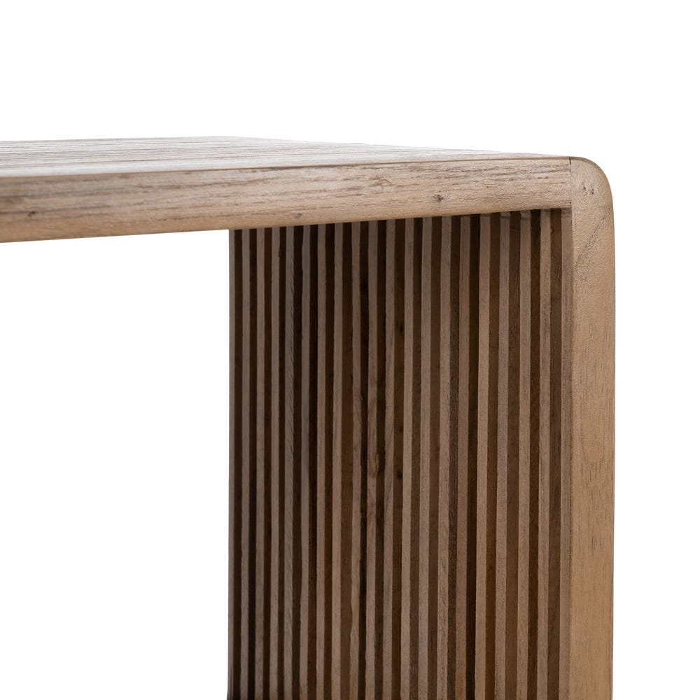 Silhueta verticală, cu margini rotunjite și ritm de șipci pe laterale, creează o prezență elegantă și aerisită. Finisajul natural al tecului evidențiază fibra lemnului, aducând căldură vizuală și un accent organic. Polițele proporționate practic oferă loc pentru cărți, ceramică, cutii decorative și plante mici.