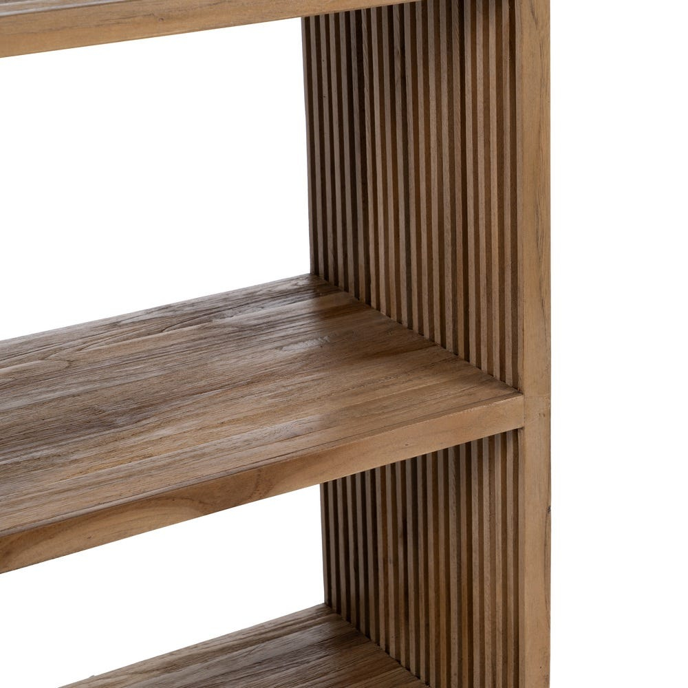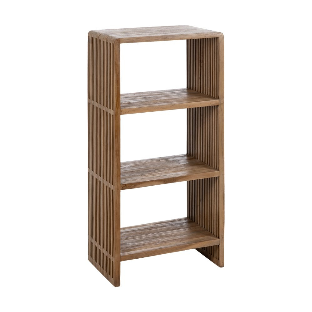 Etajeră din lemn de tec reciclat Bellamonte pentru living și hol, cu laterale din șipci tip baguette și patru niveluri deschise – piesă de depozitare premium, sustenabilă și ușor de integrat în amenajări japandi sau scandinave.