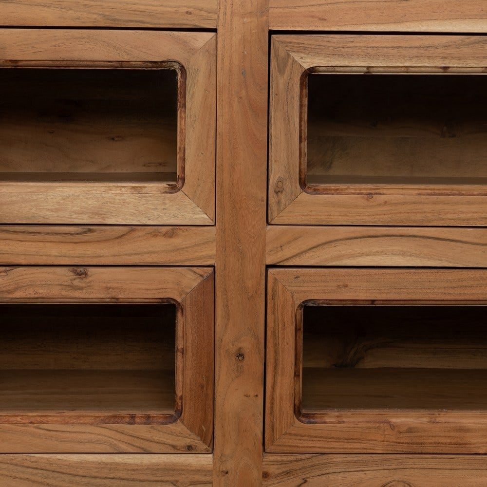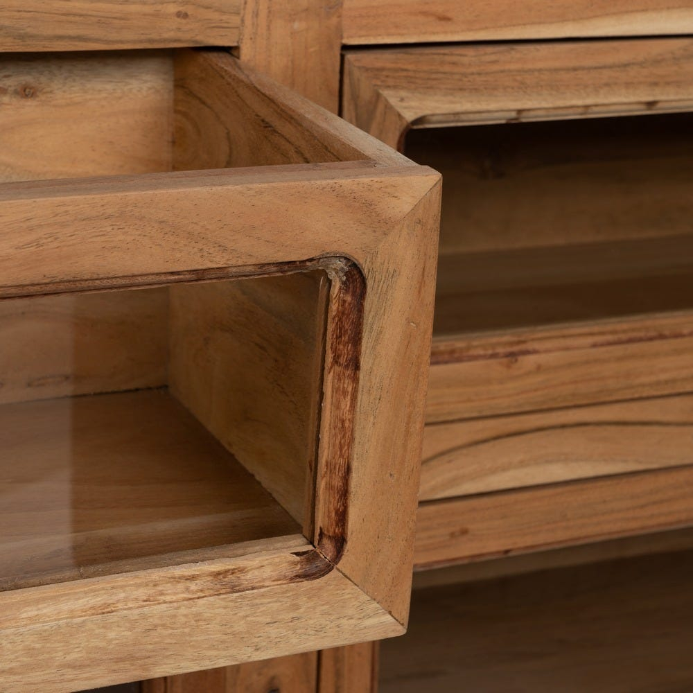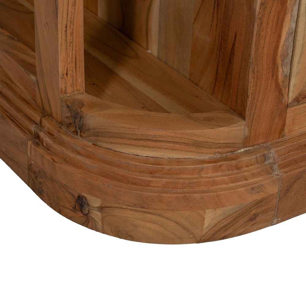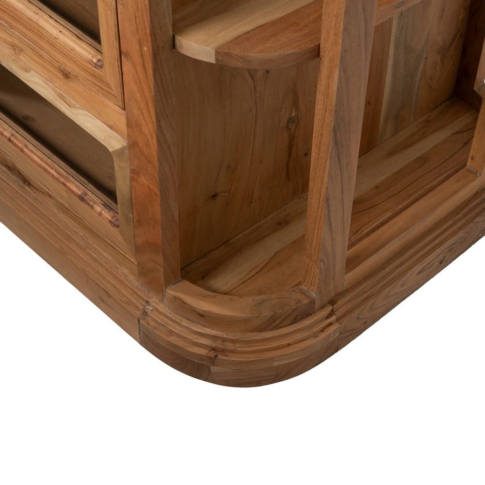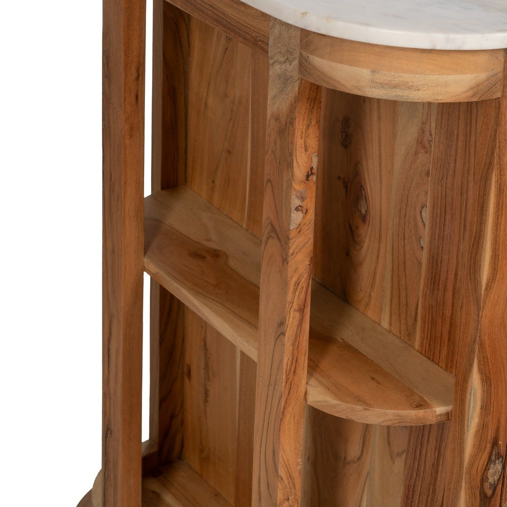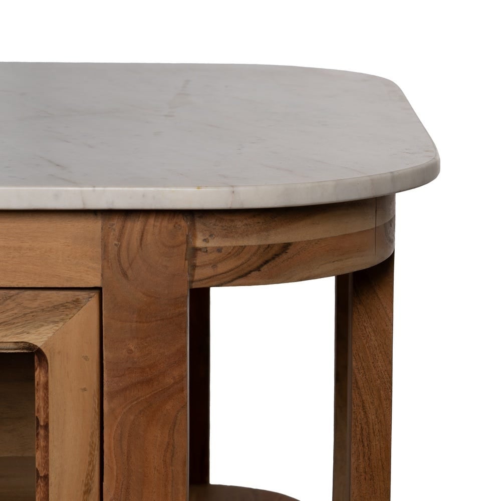 Această insulă impresionează prin combinația de lemn de mango cu un caracter cald și texturat, alături de blatul din marmură naturală cu variații unice de nuanță. Designul său funcțional include sertare accesibile pe ambele laturi și polițe laterale deschise, ideale pentru depozitare sau expunerea accesoriilor de bucătărie. Marmura naturală adaugă o notă luxoasă, iar structura solidă oferă stabilitate și durabilitate pe termen lung.