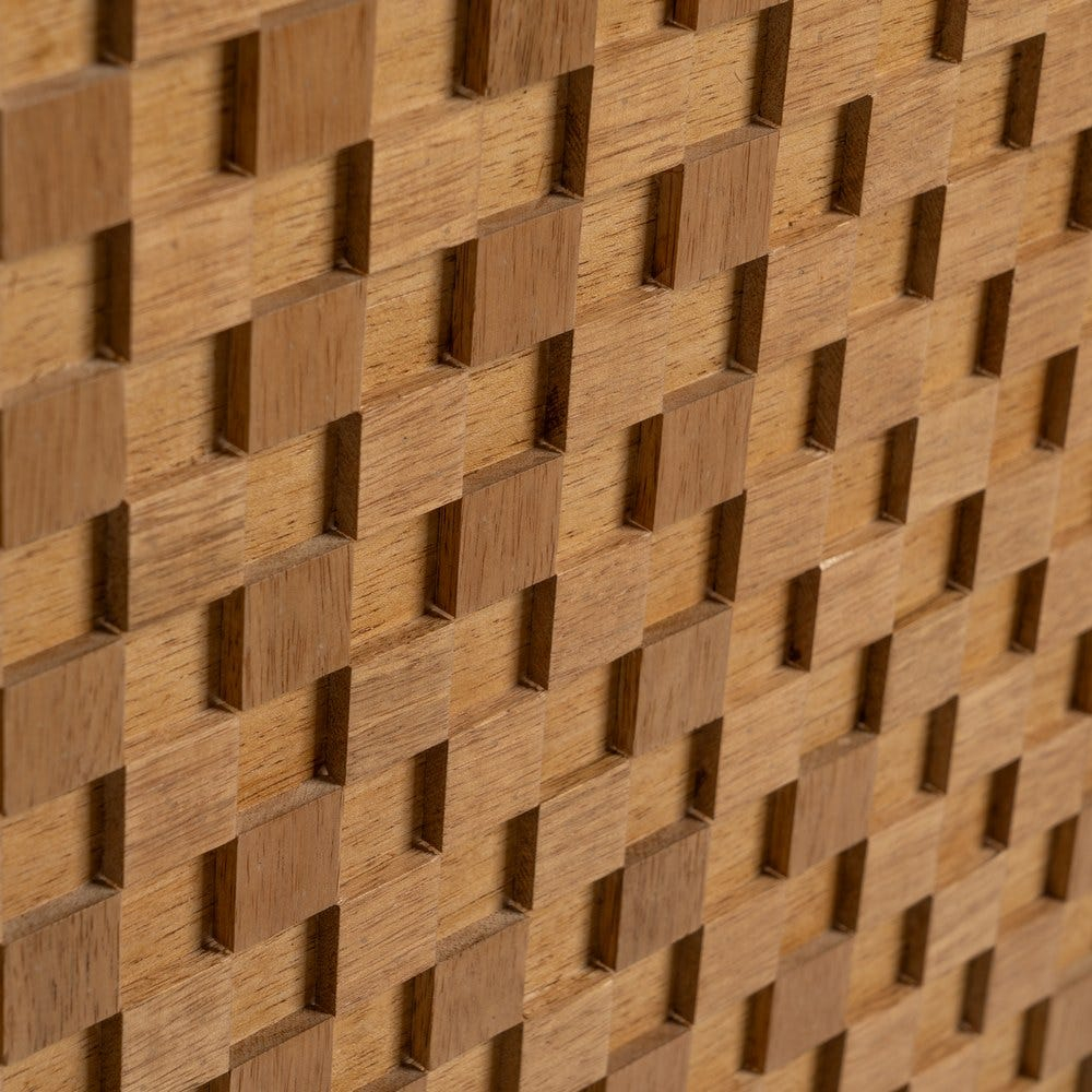 Fronturile din lemn cu model tip împletit creează relief și jocuri subtile de lumină, în timp ce nișa și sertarul centrale oferă acces rapid la dispozitive și accesorii. Baza metalică neagră ridică volumul pentru un aspect aerisit și o curățare ușoară, iar liniile curate pun în valoare textura caldă din lemn.