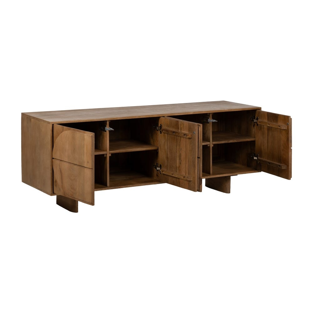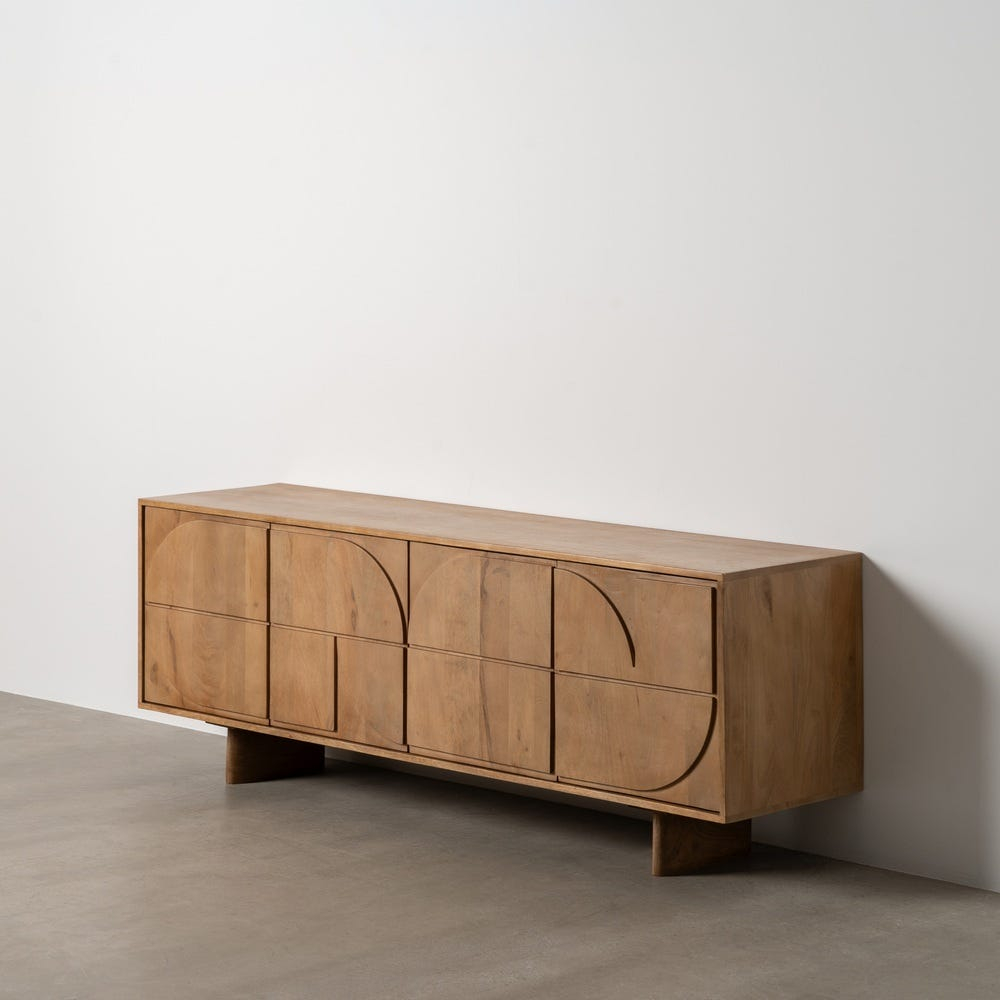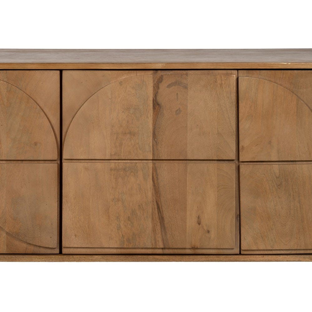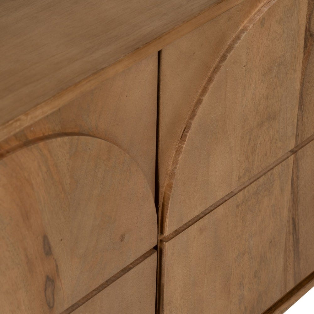 Realizată integral din lemn de mango, comoda oferă un aspect premium datorită fibrei naturale și structurii robuste. Fronturile decorate cu motive arcuite creează un joc vizual plăcut, conferind piesei o identitate aparte și un aer artistic. Picioarele înălțate la 15 cm contribuie la o siluetă aerisită, ideală pentru interioare luminoase și bine structurate. Spațiul interior este generos, ușile oferind acces facil la compartimentele potrivite pentru depozitarea accesoriilor media, cablurilor, aparaturii sau obiectelor decorative. Stabilitatea lemnului masiv și stilul geometric fac din această comodă TV o alegere durabilă și versatilă pentru livingurile moderne. ✔ Design geometric sculptat pe fronturile ușilor ✔ Lemn de mango natural în nuanță honey ✔ Compartimentare practică pentru organizare ✔ Picioare înălțate pentru un aspect modern și aerisit ✔ Ideală pentru televizoare mari și decoruri contemporane