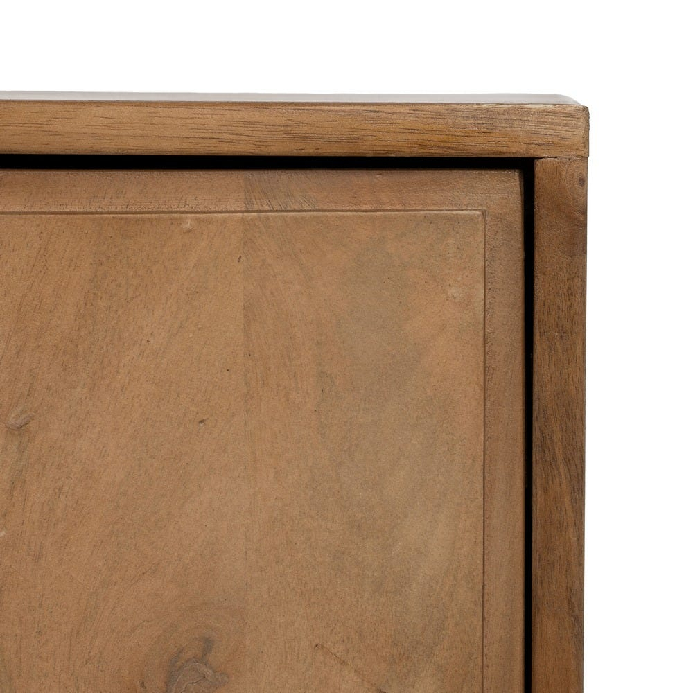 Această comodă TV din lemn de mango impresionează prin liniile sale sculpturale și aspectul geometric al fronturilor, aducând o estetică modernă și caldă în orice living. Nuanța honey accentuează textura naturală a lemnului masiv, transformând piesa într-un element central al decorului contemporan.