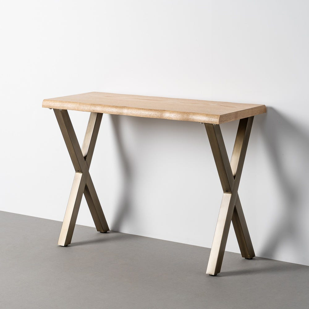 Picioarele metalice dispuse în formă de X susțin structura și creează un contrast plăcut cu suprafața blatului. Designul deschis păstrează un aspect aerisit și face consola ușor de integrat în spații moderne.
