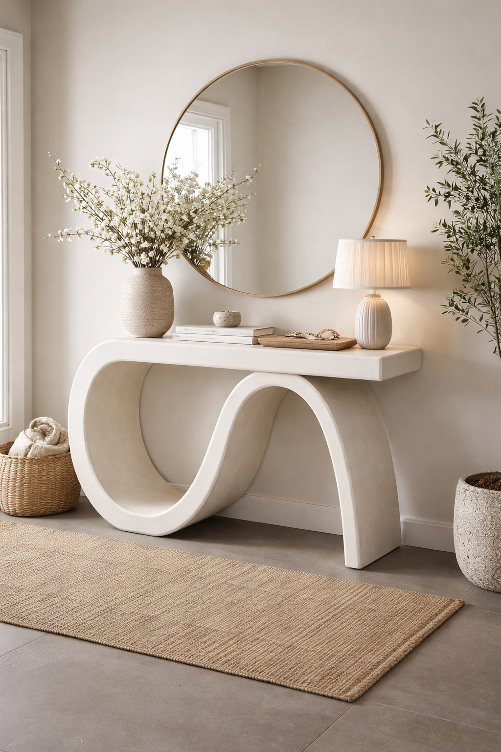 Sfatul designerului CreativDeco: lasă consola să respire vizual și nu o aglomera. Alege unul sau două obiecte decorative simple, în tonuri naturale sau contrastante, pentru a evidenția forma sa curbată.