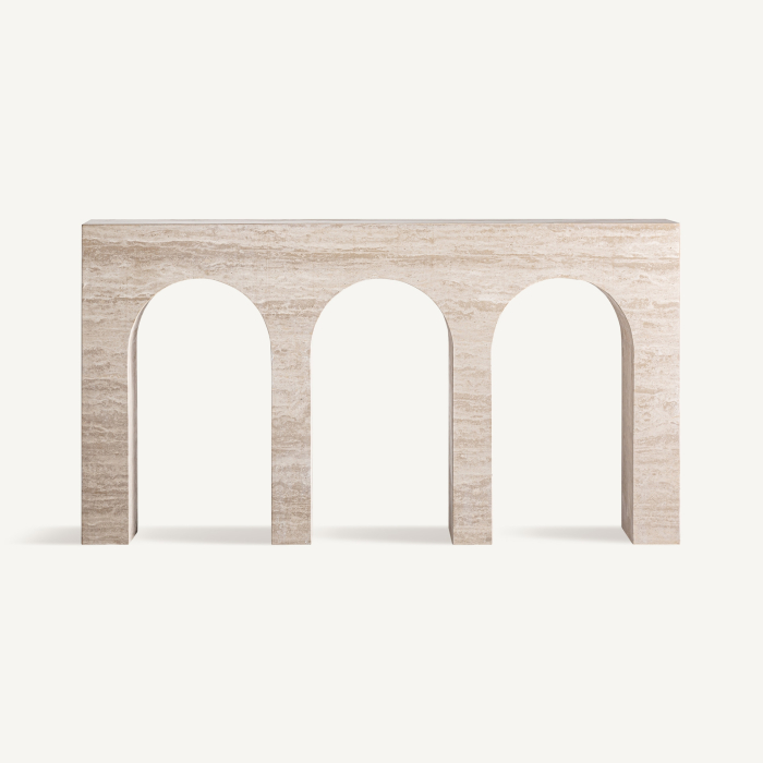 Dimensiuni totale: 150 x 35 x 80 cm Material: travertin bej Distanță între picioare: 35,5 cm Tip picioare: fixe Greutate maximă suportată: 60 kg Greutate: 155,4 kgCorpul masiv al consolei este sculptat în travertin și definitor sunt cele trei arcade tratate cu tăieturi clare, care creează o secvență ritmică și un efect de profunzime. Finisul natural al pietrei pune în valoare variațiile tonale caracteristice travertinului, oferind textură și o patină subtilă ce evoluează în timp.