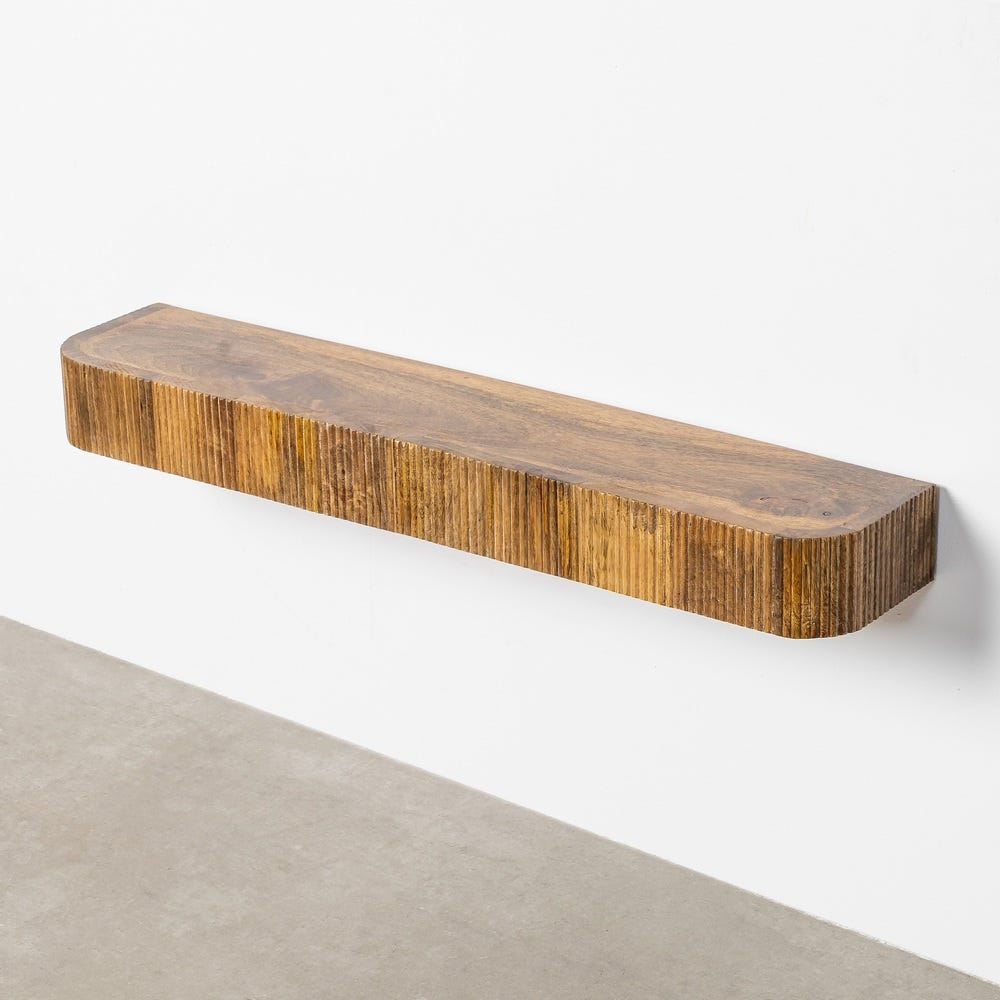Lemnul masiv de mango este finisat într-o nuanță caldă, naturală, iar detaliul frontal cu striații verticale adaugă profunzime vizuală și textură, fără a încărca compoziția. Designul suspendat contribuie la un aspect aerisit și ordonat, integrându-se ușor în interioare contemporane cu influențe naturale.