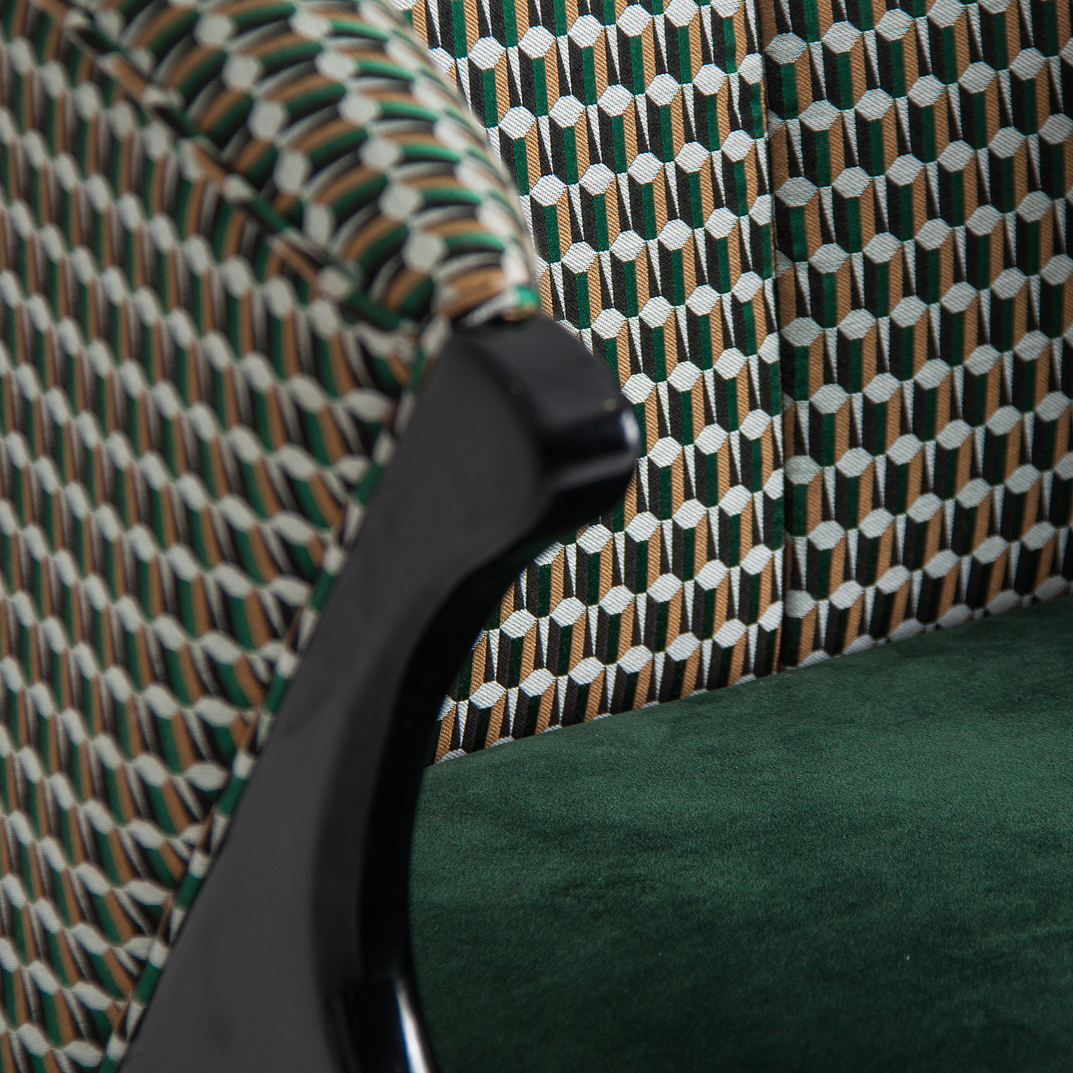 Fotoliu contemporan din lemn de pin și catifea verde. Design curat și aspect organic, ideal pentru a adăuga un accent modern și confortabil în living sau dormitor.