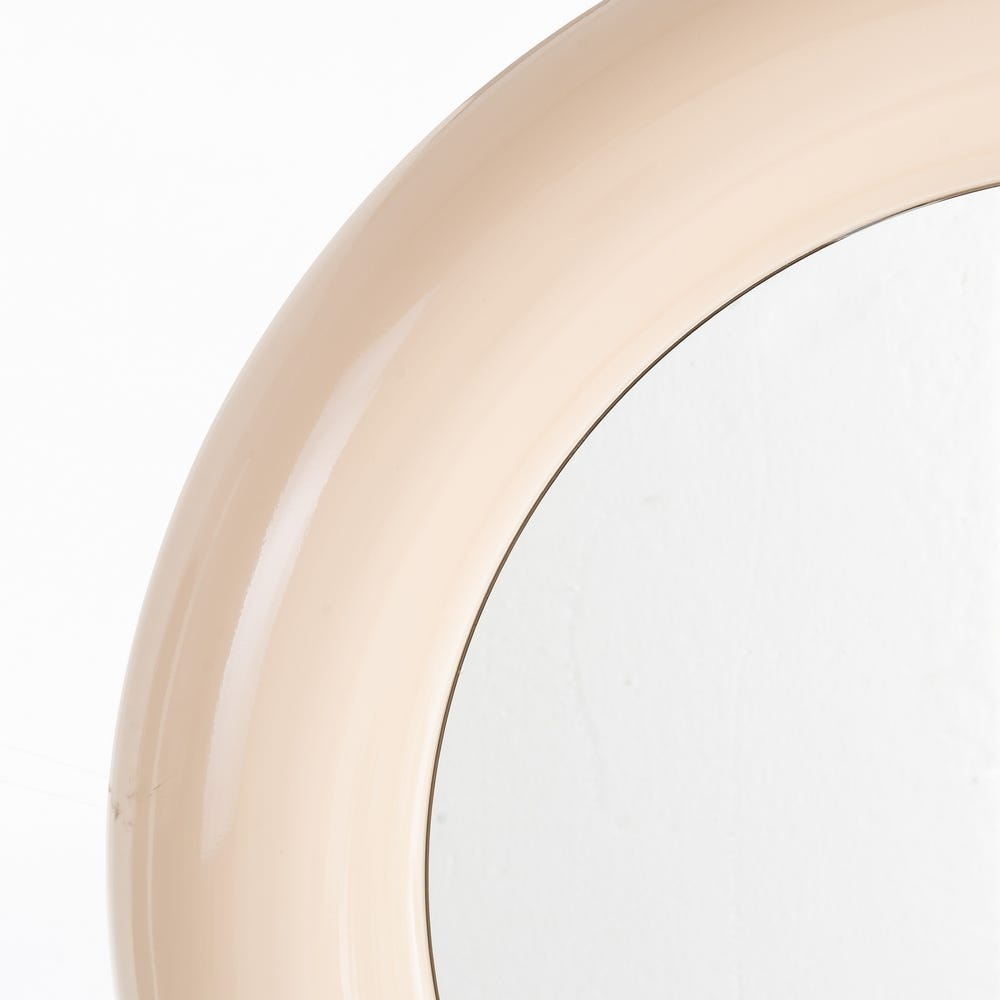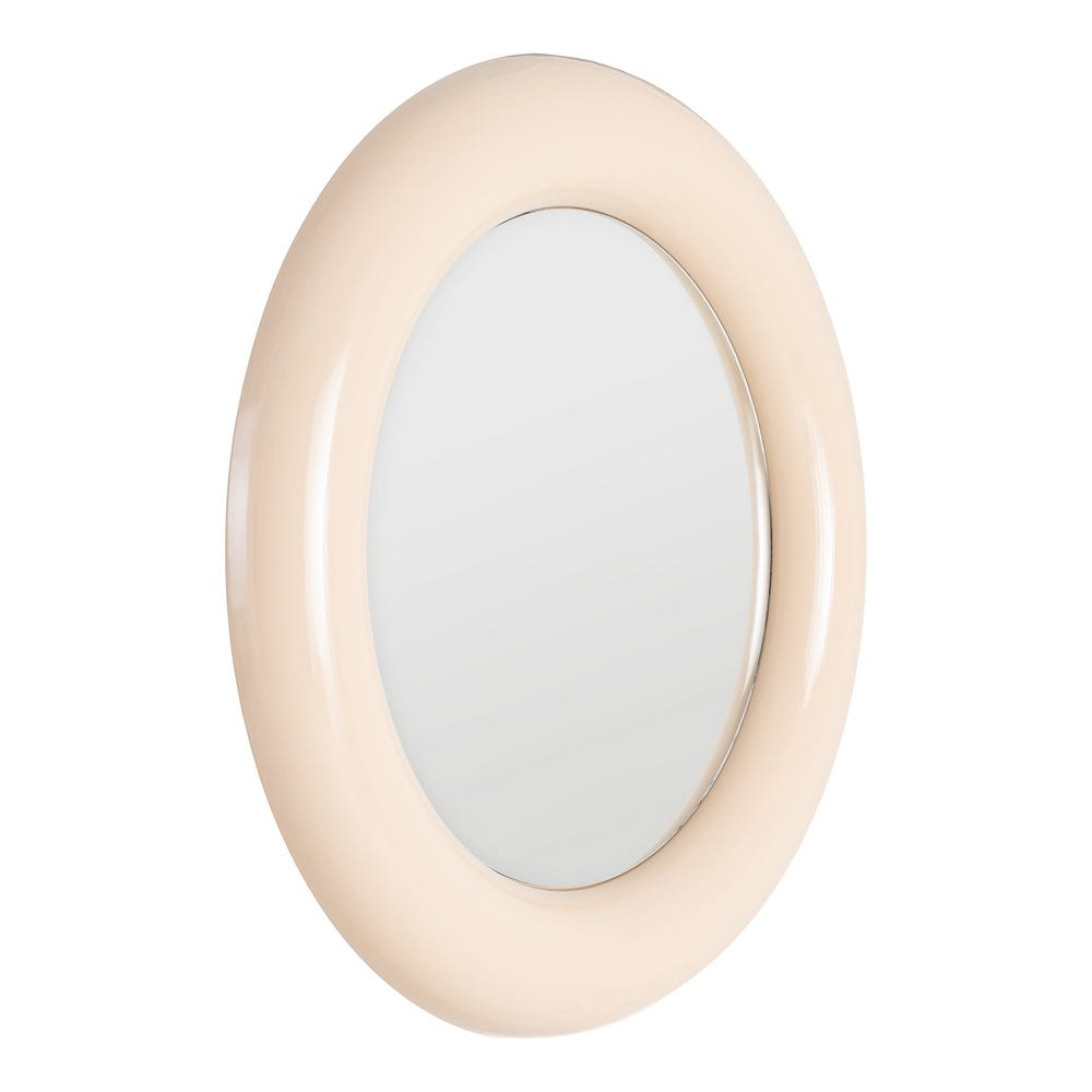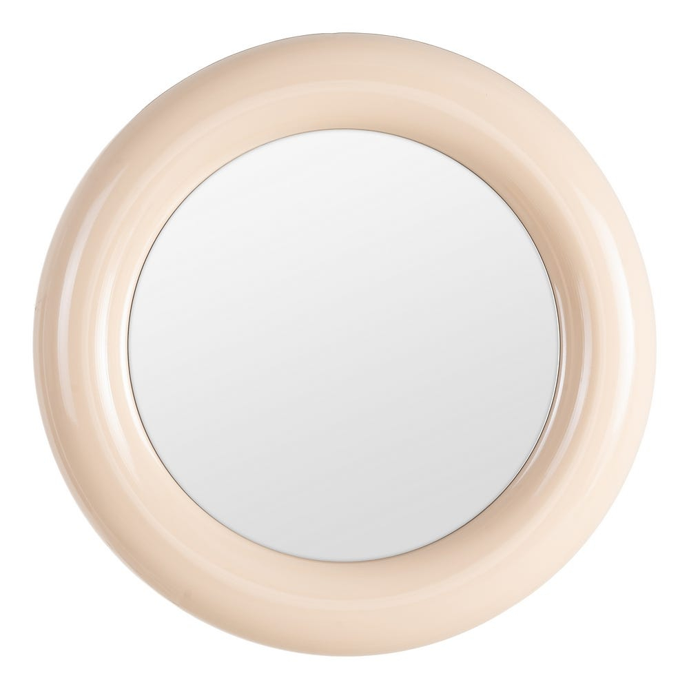 Rama rotundă, cu profil generos și margini rotunjite, creează un joc plăcut de reflexii. Suprafața centrală, de 55 cm diametru, reflectă clar și mărește vizual încăperea, în timp ce bejul lucios conturează delicat cercul și îi dă profunzime.
