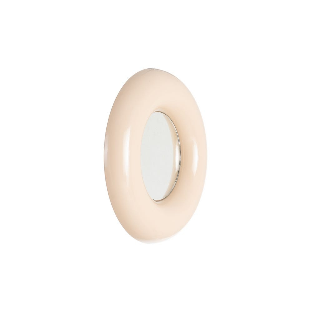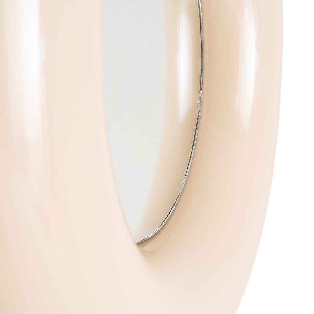 Rama circulară are un profil rotunjit, generos, cu reflexii uniforme care captează lumina naturală și creează profunzime vizuală. Suprafețele netede și nuanța de bej pun în valoare oglinda centrală și oferă o prezență discretă, elegantă.