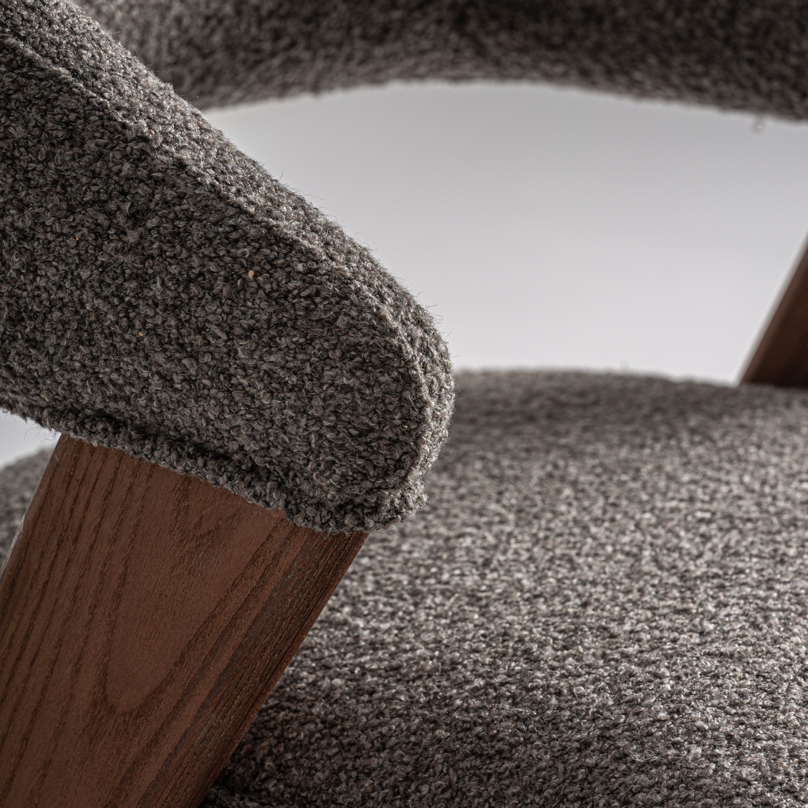 Tapiseria din stofă gri jaspeado adaugă profunzime vizuală și o senzație plăcută la atingere, în timp ce structura din lemn de roble în nuanță maro completează armonios ansamblul cu un aer cald și autentic. Liniile sale fluide și brațele integrate creează o siluetă contemporană, ușor de integrat în spații moderne sau naturale.