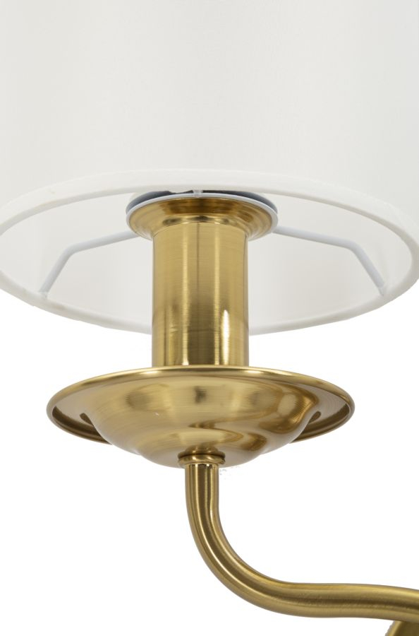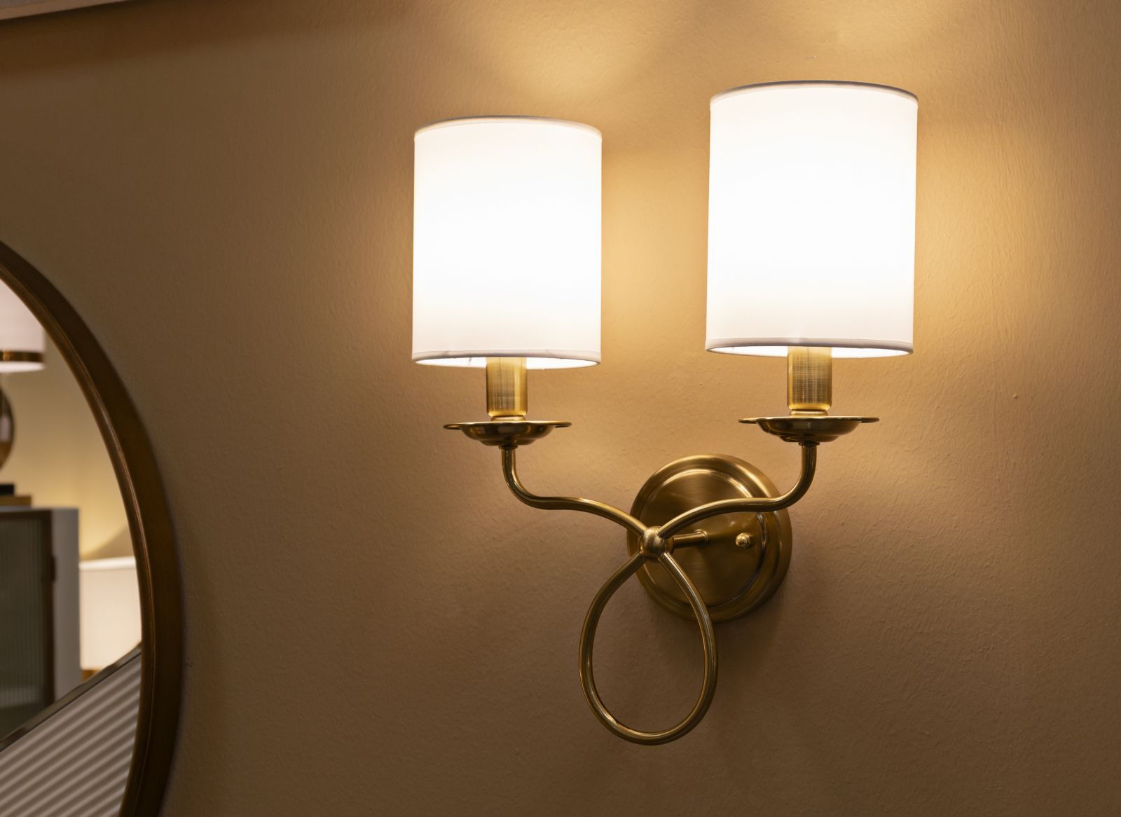 Forma sa simetrică, cu brațe arcuite și detalii aurii, creează un efect vizual sofisticat, ideal pentru a lumina coridoare, livinguri sau dormitoare cu stil. Abajururile cilindrice din material textil difuzează lumina într-un mod plăcut și uniform, adăugând un aer cald și primitor.