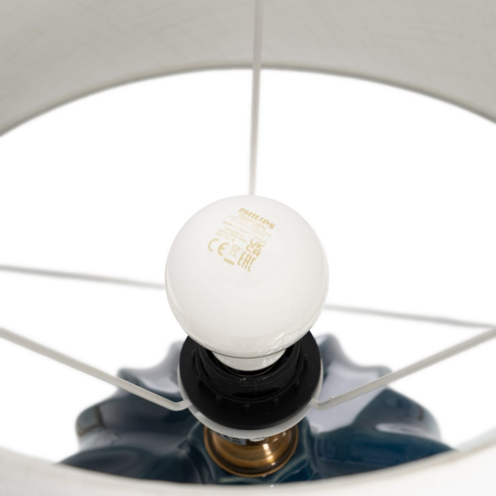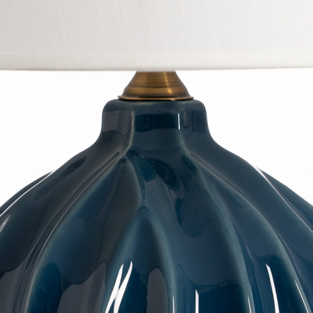Forma organică și finisajul lucios al bazei conferă o eleganță subtilă, iar contrastul dintre albastrul adânc și albul abajurului creează un efect vizual calm, potrivit pentru dormitoare, livinguri sau birouri decorate în stil modern, marin sau scandinav.