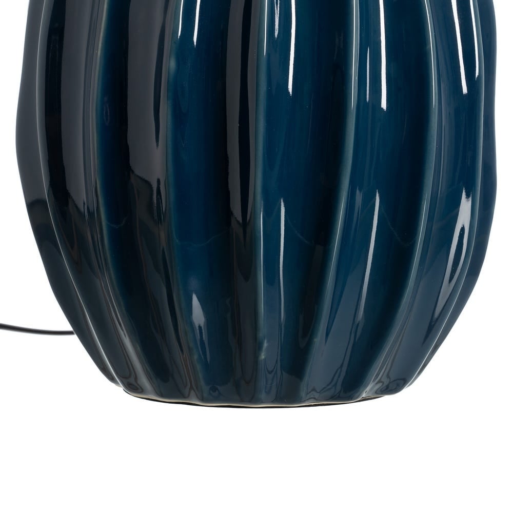 O lampă elegantă și atemporală, perfectă pentru a adăuga o notă de rafinament și calm oricărui spațiu. Baza ceramică albastru intens, cu formă rotunjită și striații verticale fine, se îmbină armonios cu abajurul conic alb din material textil, oferind o lumină difuză și plăcută.
