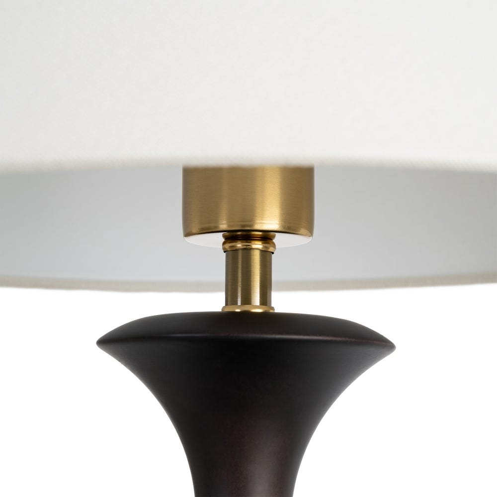 Formele fluide și proporțiile atent echilibrate transformă această lampă într-un element care adaugă eleganță și profunzime vizuală în orice încăpere. Baza sculpturală din lemn maro închis creează un punct de interes discret, completat de abajurul alb care aduce lumină și echilibru.