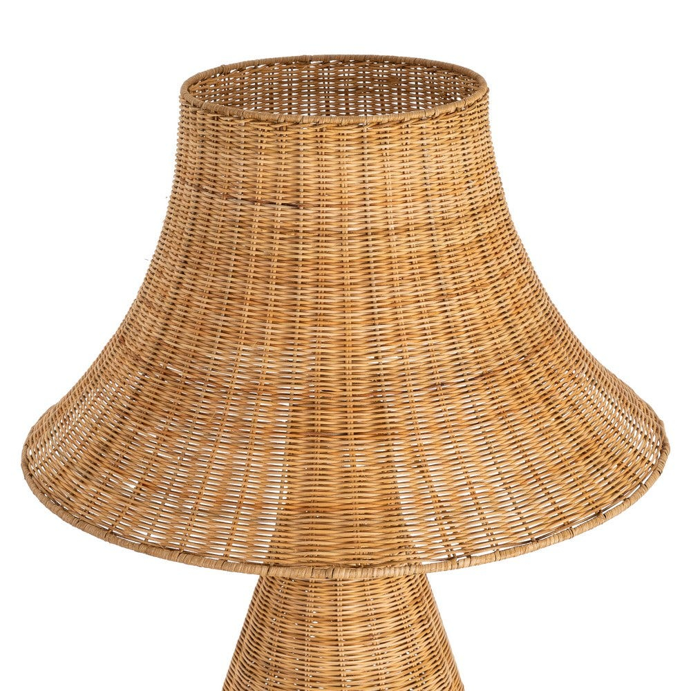Baza lampadarului este alungită și curbată, evocând un vas ceramic, iar împletitura densă de ratan conferă stabilitate și un aspect rafinat. Abajurul conic, amplu, amplifică efectul vizual și permite luminii să se disperseze uniform, generând o atmosferă caldă și relaxantă.