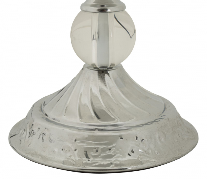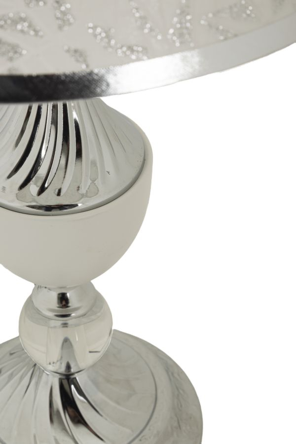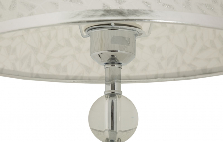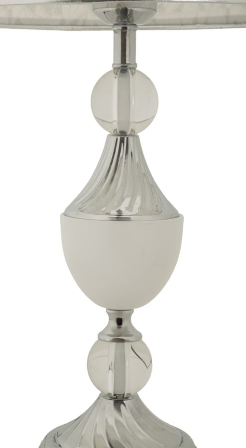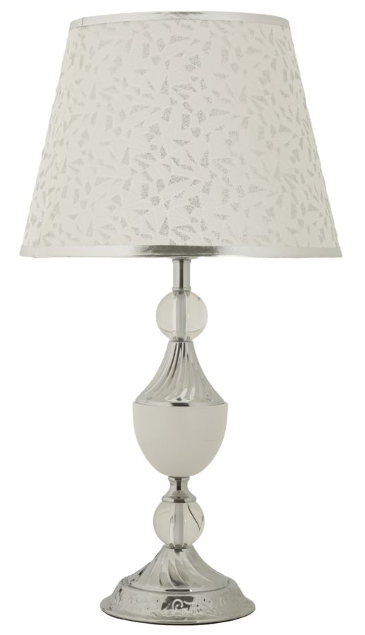 Lampa de masă Kody adaugă o notă de rafinament și eleganță oricărui spațiu. Realizată din metal rezistent, completată de detalii din sticlă și un abajur alb decorat discret cu modele argintii, aceasta este ideală pentru a crea o atmosferă luminoasă și sofisticată.