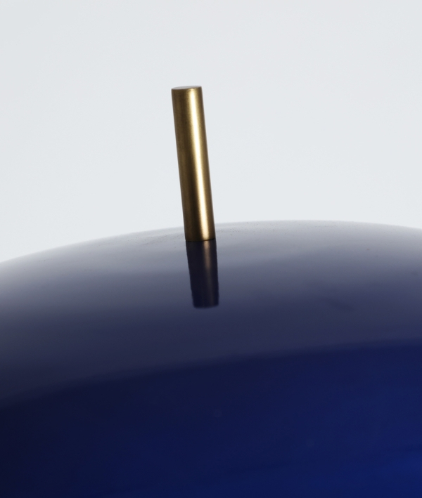 Lampa de podea GLITTER este o piesă decorativă îndrăzneață și sofisticată, ce combină armonios formele sculpturale cu contrastele cromatice elegante. Structura sa aurie, abajurul albastru lucios și baza gri mat creează un efect vizual modern, plin de rafinament și expresivitate.