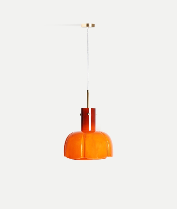 Lampă suspendată cu personalitate, realizată din sticlă portocalie intensă și finisaje metalice aurii, ideală pentru a aduce o notă vibrantă și sofisticată în orice interior modern sau retro.