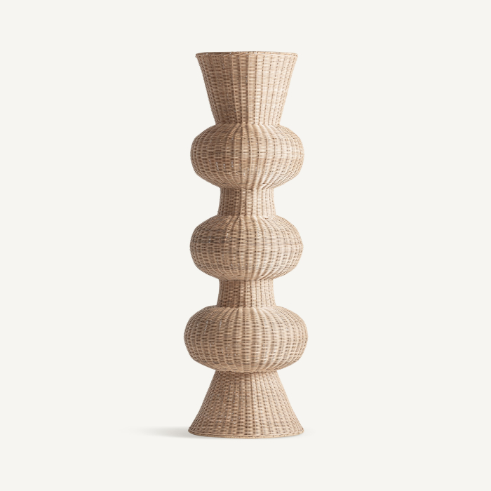 Această lampă de podea se remarcă printr-un design sculptural puternic, construit din volume rotunjite suprapuse, realizate integral din ratan în nuanță maro. Forma verticală și textura naturală transformă lampadarul într-o piesă decorativă centrală, potrivită pentru interioare amenajate în stil boho sau cu accente naturale.