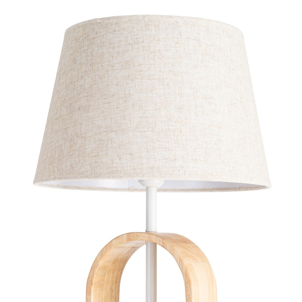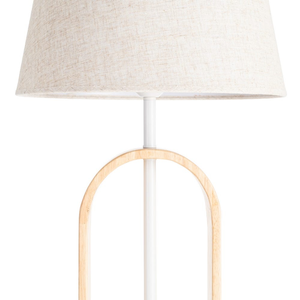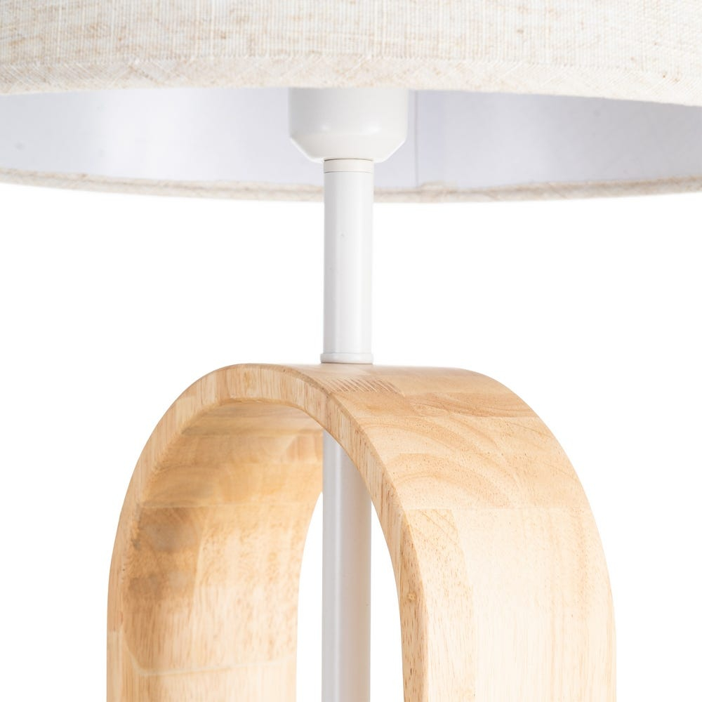 Baza rotundă, albă, susține o tijă metalică subțire în jurul căreia se dezvoltă un cadru oval alungit din lemn natur, cu colțuri rotunjite și suprafețe netede. Deasupra, abajurul conic trunchiat din in, în bej deschis, completează compoziția cu o textură fină și un look calm, modern.