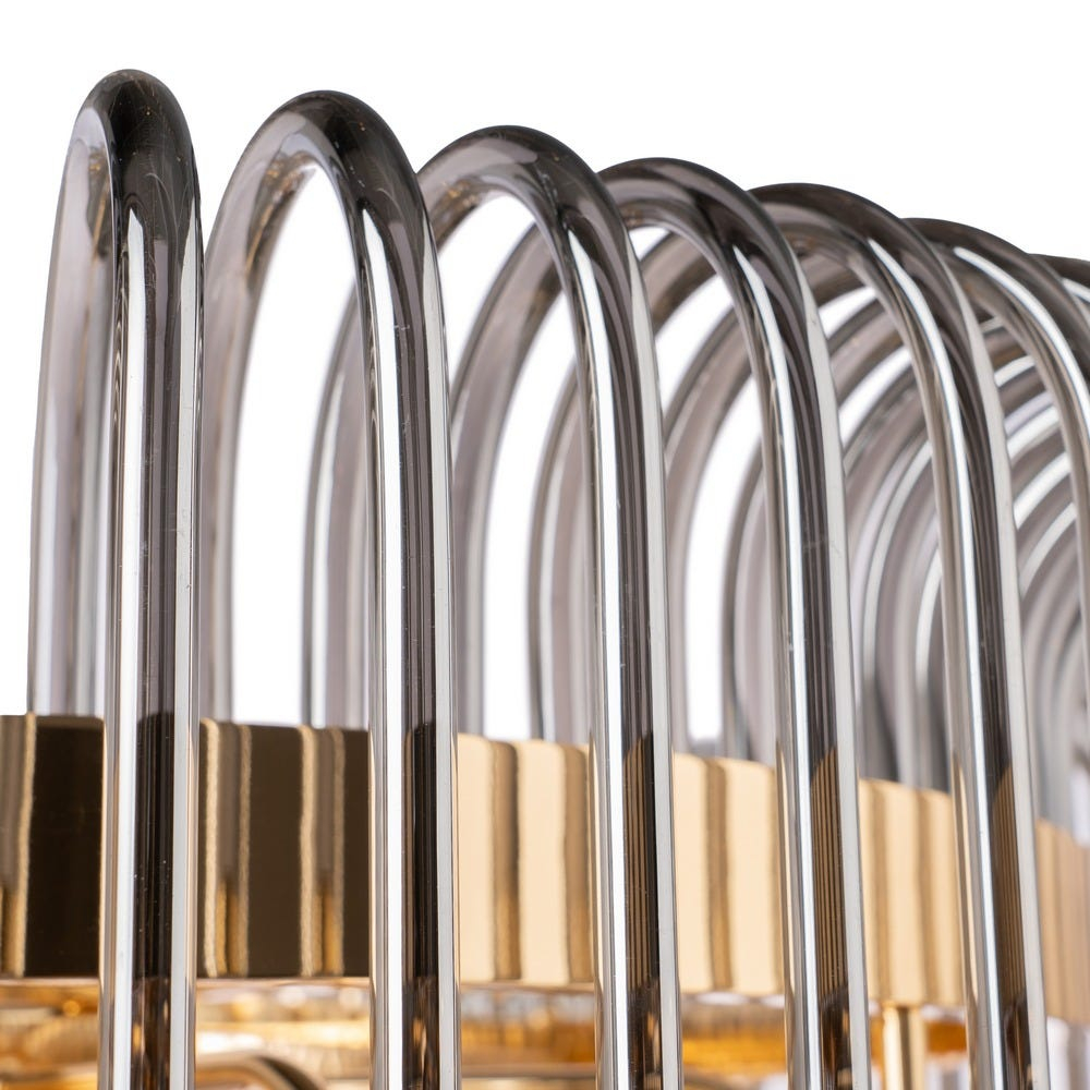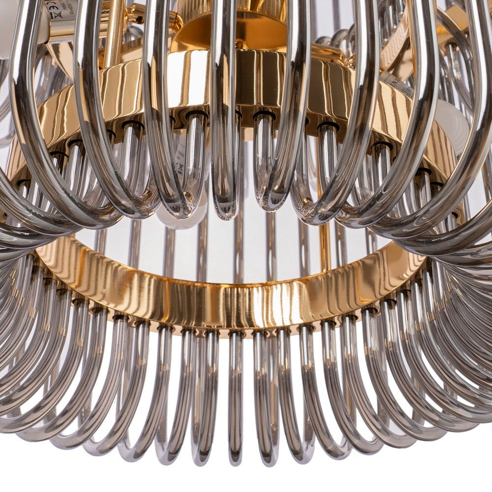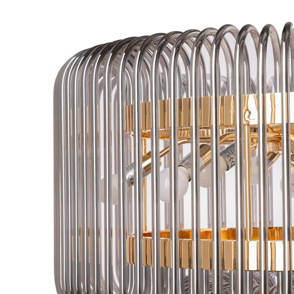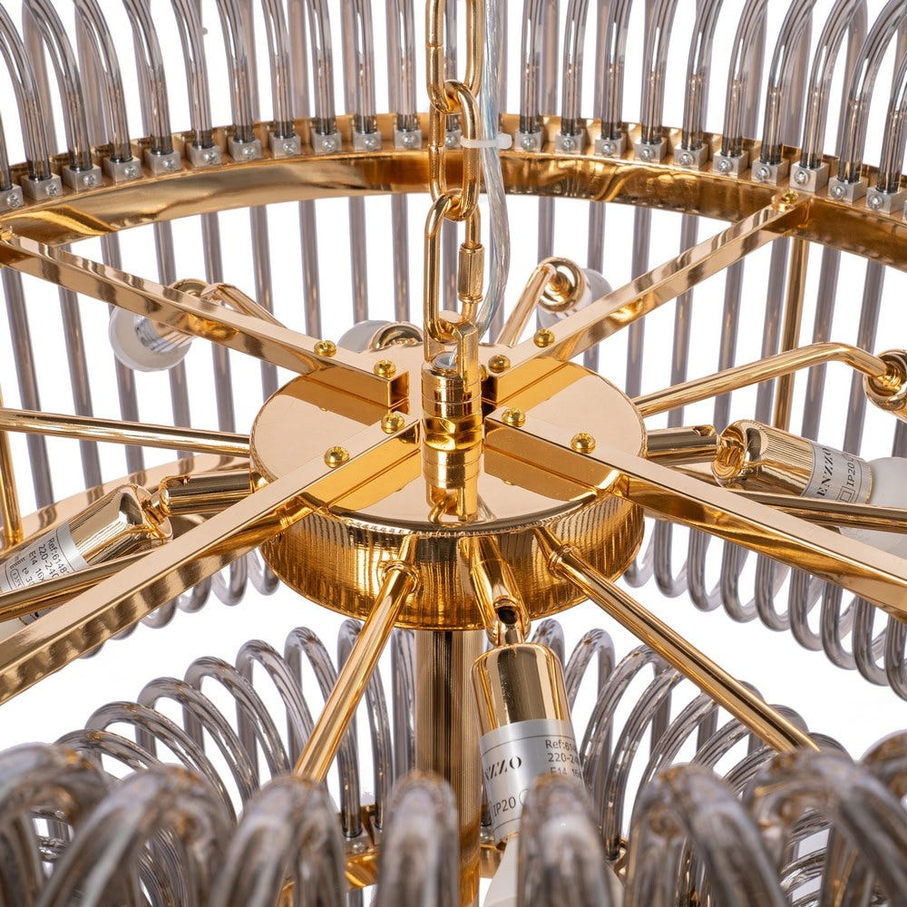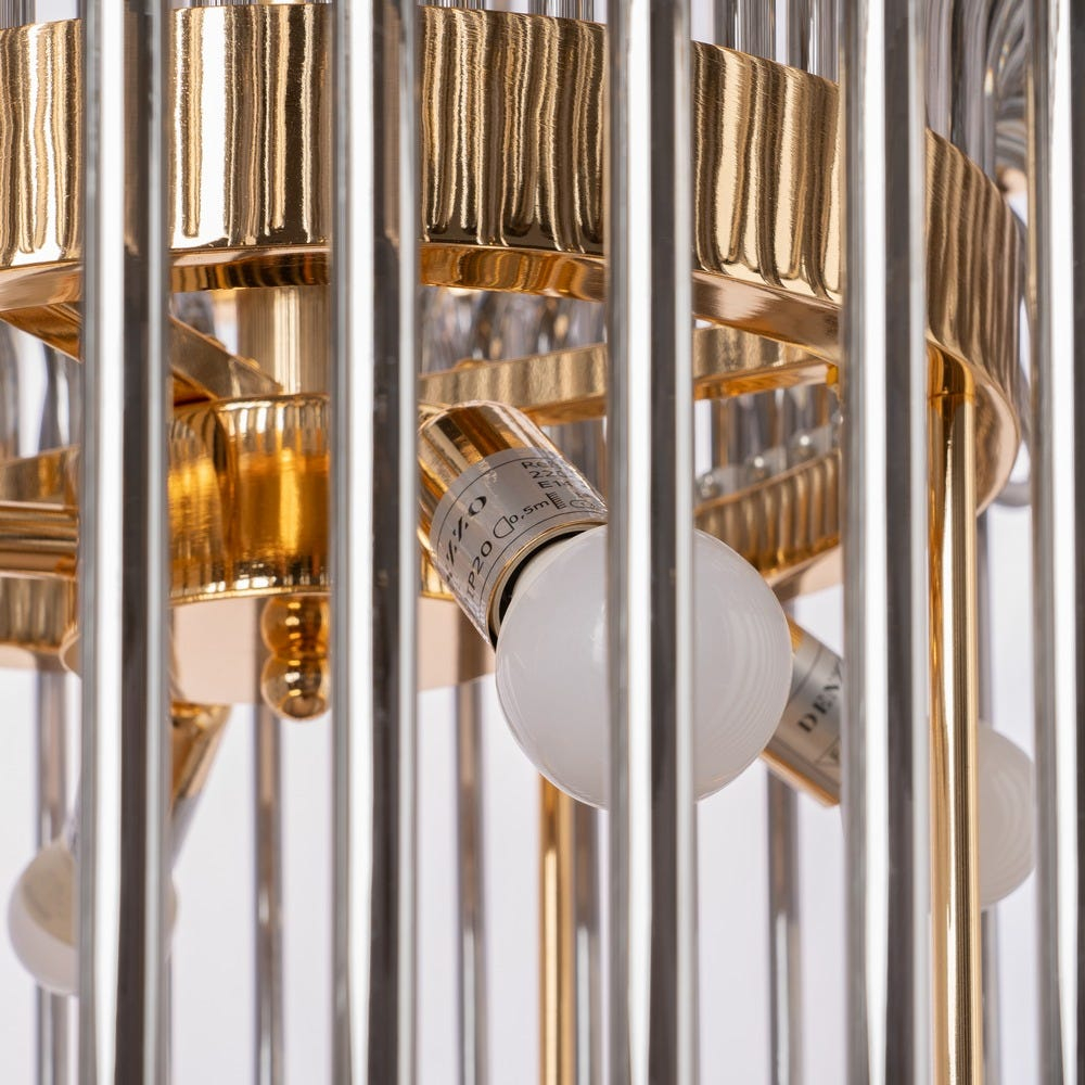 Designul pe două etaje al lustrei creează un efect tridimensional și o senzație de opulență modernă. Exteriorul este definit de tuburile metalice verticale (gri cromat), care filtrează și difuzează lumina, în timp ce inelele orizontale aurii adaugă un accent vizual vibrant. Fiind o piesă de dimensiuni XXL, aceasta necesită un spațiu adecvat pentru a-și etala frumusețea. Lanțul de suspendare de 130.0 cm permite ajustarea înălțimii, asigurând o potrivire ideală în încăperile înalte.