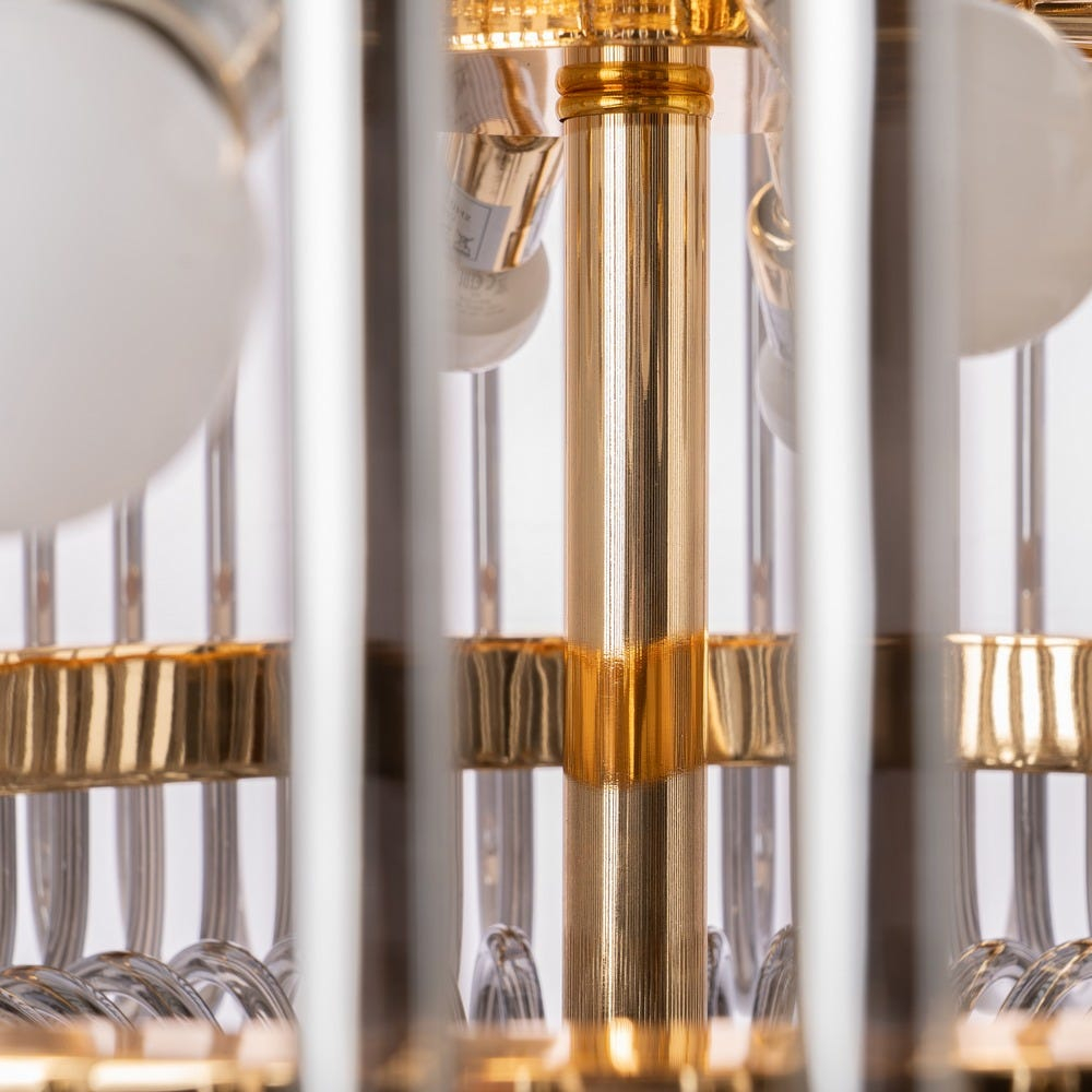 Lustra este construită pentru o iluminare masivă, fiind dotată cu 16 dulii E14. Această capacitate o face ideală pentru a fi singura sursă de lumină într-un spațiu larg. Realizată din sticlă și fier, are o construcție extrem de solidă, confirmată de greutatea de 38.0 kg. Datorită acestei greutăți considerabile, este obligatoriu ca montajul să fie realizat pe un tavan ferm și robust, pentru a garanta stabilitatea și siguranța produsului pe termen lung.