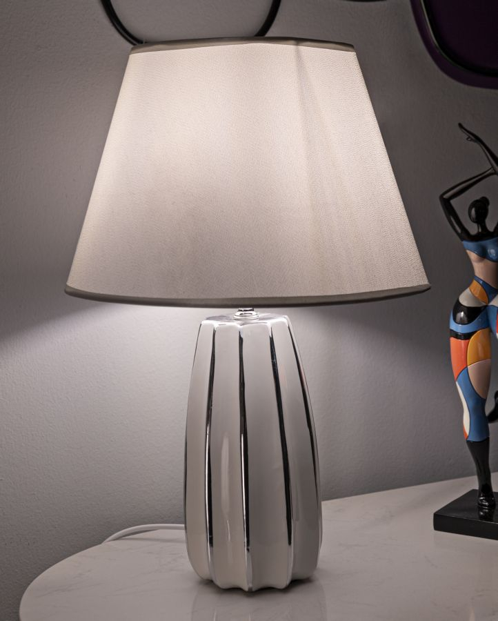 Acest set de veioze se evidențiază prin baza elegantă din ceramică argintie, cu un finisaj lucios și delicat striat, care reflectă lumina și adaugă rafinament decorului. Forma abajurului conic, realizat în tonuri de gri deschis cu textură subtilă, completează armonios designul modern și conferă un plus de stil și eleganță spațiului.