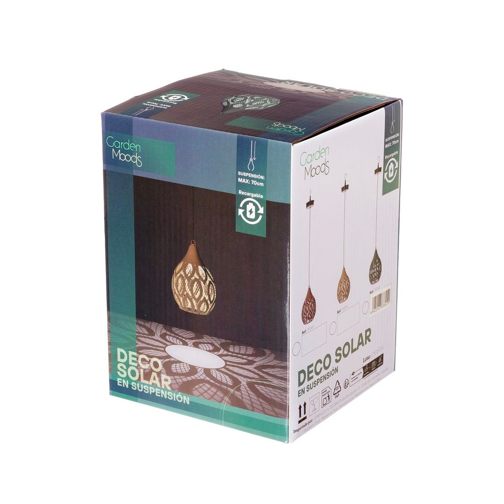 Adaugă o notă de eleganță boemă în grădină, terasă sau balcon cu această lampă solară suspendată SHEREZADE în finisaj verde mat. Cu un design inspirat din lămpile orientale, corpul metalic perforat proiectează umbre decorative delicate în timpul serii, pentru o atmosferă relaxantă și intimă.