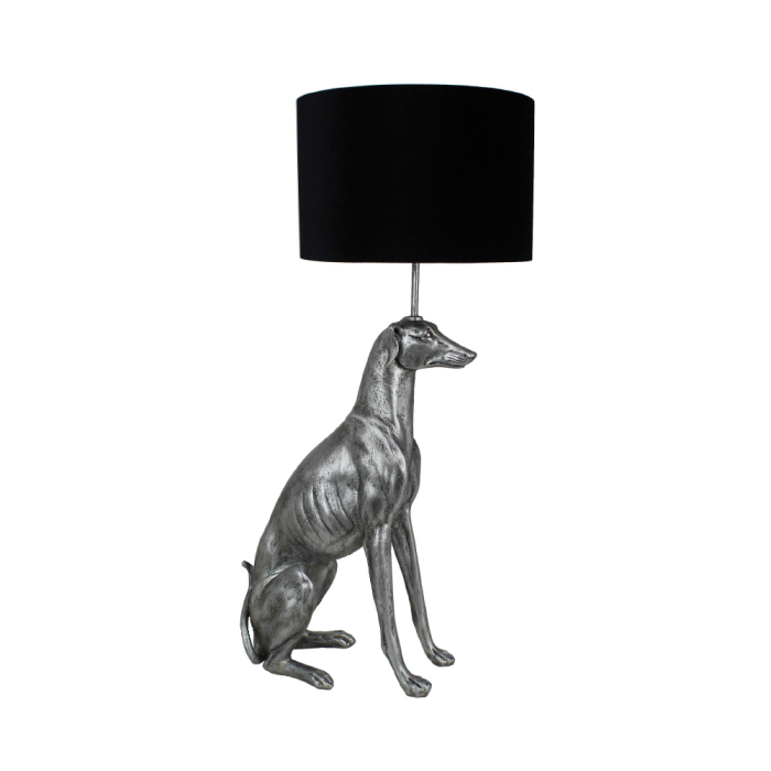 Veioză argintie cu abajur negru, ideală pentru interioare elegante și spații cu accente glam. Modelul CAO atrage prin baza sa sculpturală din polirășină și contrastul sofisticat dintre finisajul metalic și materialul textil profund al abajurului.