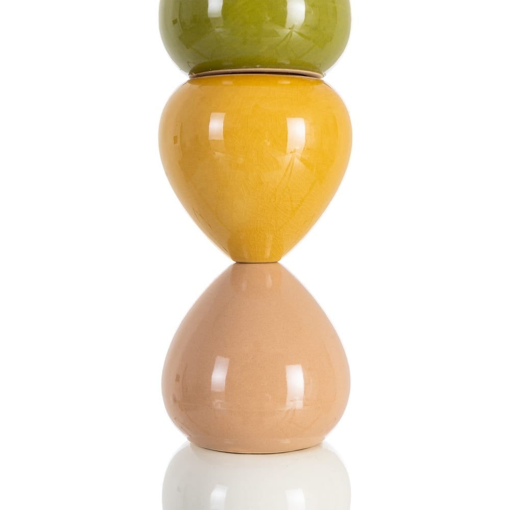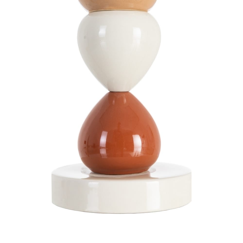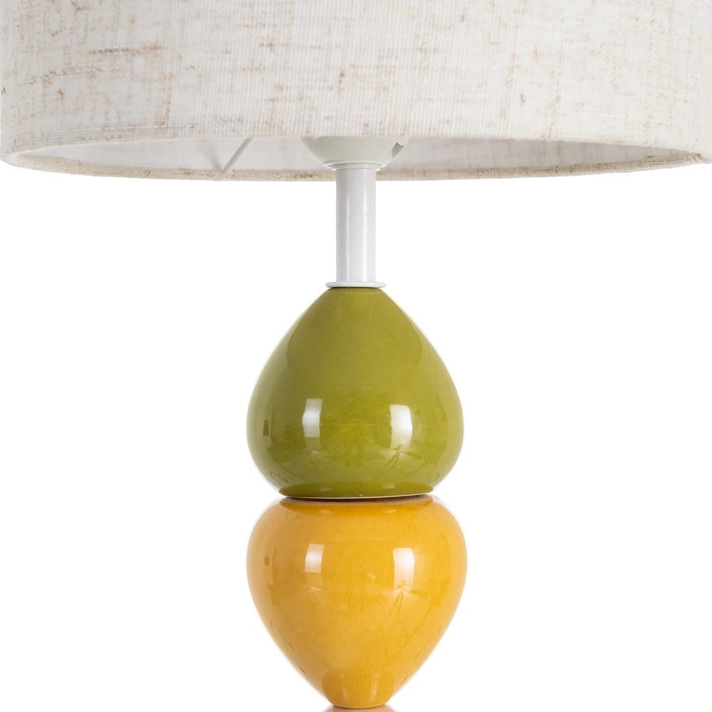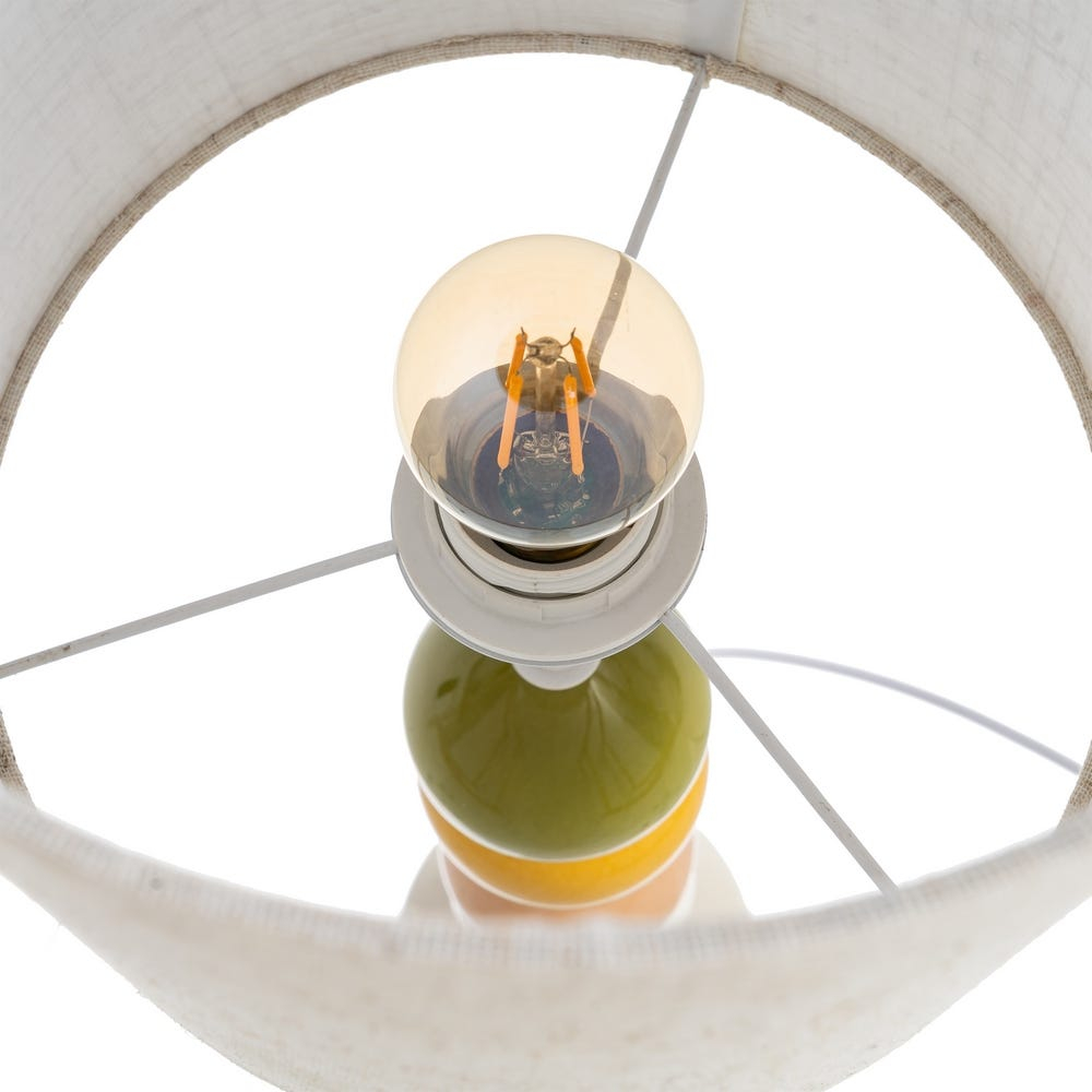 Veioză colorată cu bază ceramică și abajur textil: accente cromatice vii și siluetă înaltă pentru decoruri moderne sau eclectice. Abajur textil crem/alb natural oferă lumină caldă și uniformă. Compatibilă cu dulie E27, bec până la 60W (neinclus).