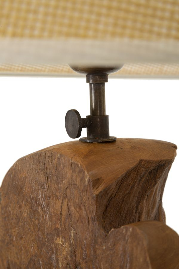 Veioza Kepala impresionează prin designul său unic, având ca bază o bucată de lemn de tec reciclat, sculptată natural de timp și elemente. Fiecare piesă este unică, cu forme și texturi organice care transformă acest obiect într-o adevărată operă de artă funcțională. Abajurul textil, într-o nuanță caldă de crem, completează perfect caracterul natural al bazei, difuzând o lumină plăcută și relaxantă.