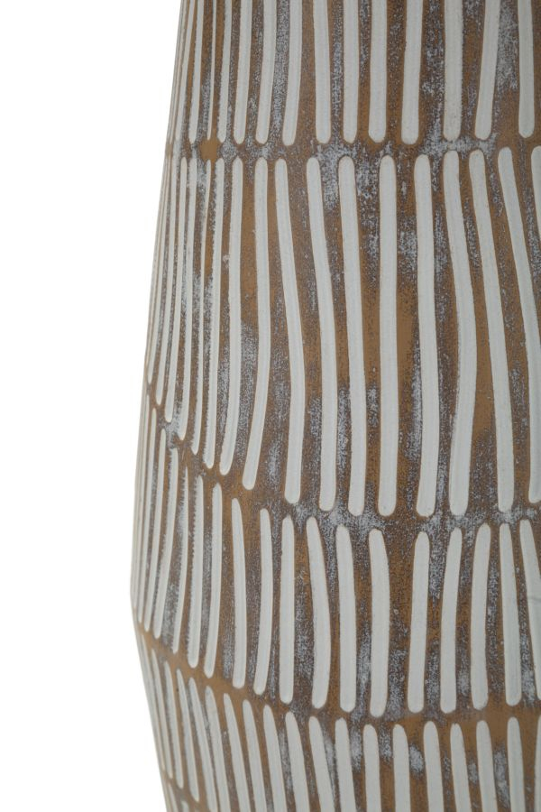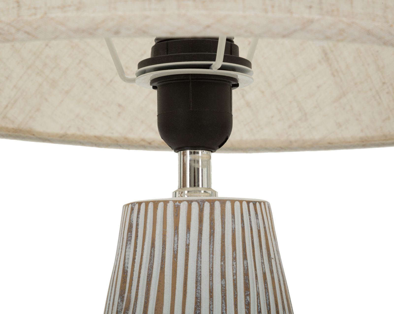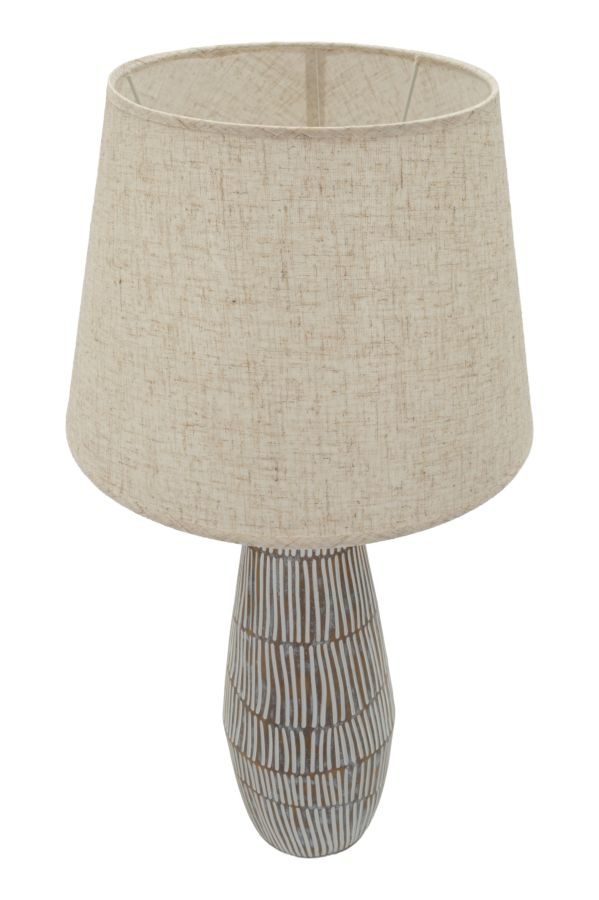Baza cu formă verticală este decorată cu linii gravate care creează un efect vizual ritmic și texturat. Nuanțele naturale ale finisajului sunt puse în valoare de abajurul textil bej, care adaugă căldură și echilibru compoziției.