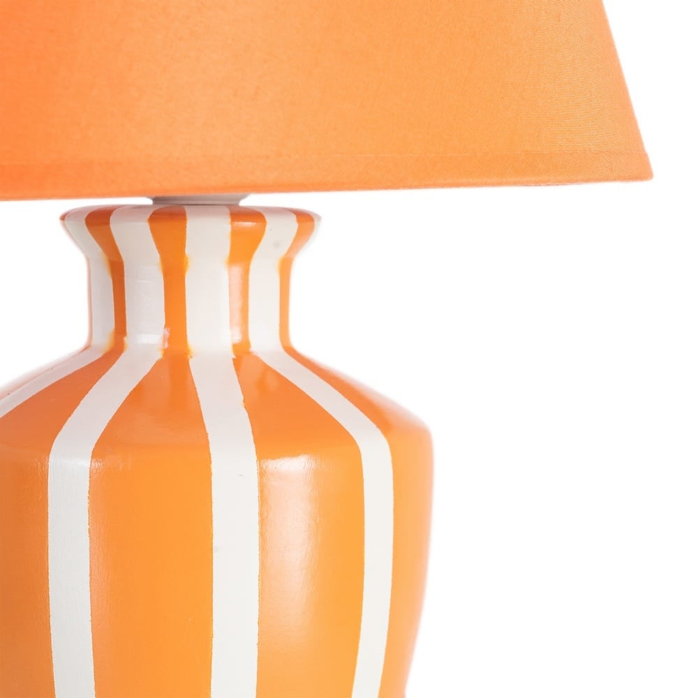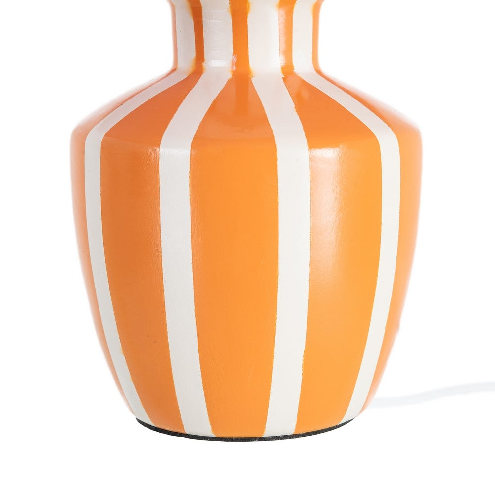 Vibrantă și plină de energie, această veioză din ceramică portocalie aduce o notă veselă și modernă în orice spațiu. Baza decorată cu dungi verticale albe este completată de un abajur textil conic în aceeași nuanță luminoasă, formând un ansamblu unitar și plin de personalitate.