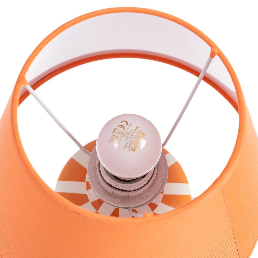 Designul în dungi albe adaugă profunzime vizuală și un ritm grafic plăcut, în timp ce tonul portocaliu transmite căldură și vitalitate. Lumina difuzată prin abajurul textil creează o atmosferă primitoare, ideală pentru colțurile de lectură, noptieră sau birou.