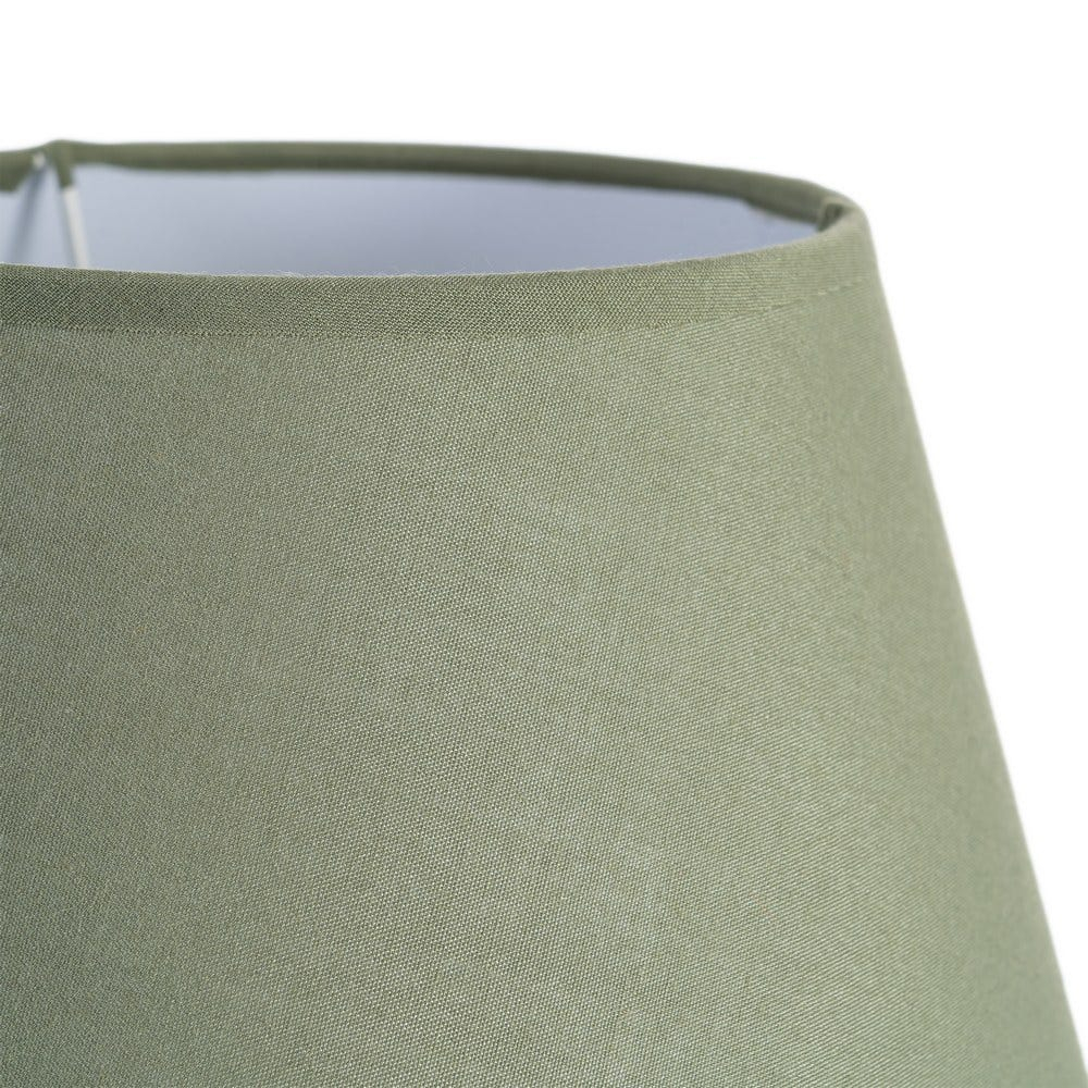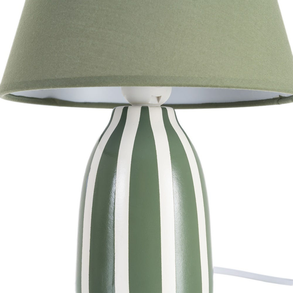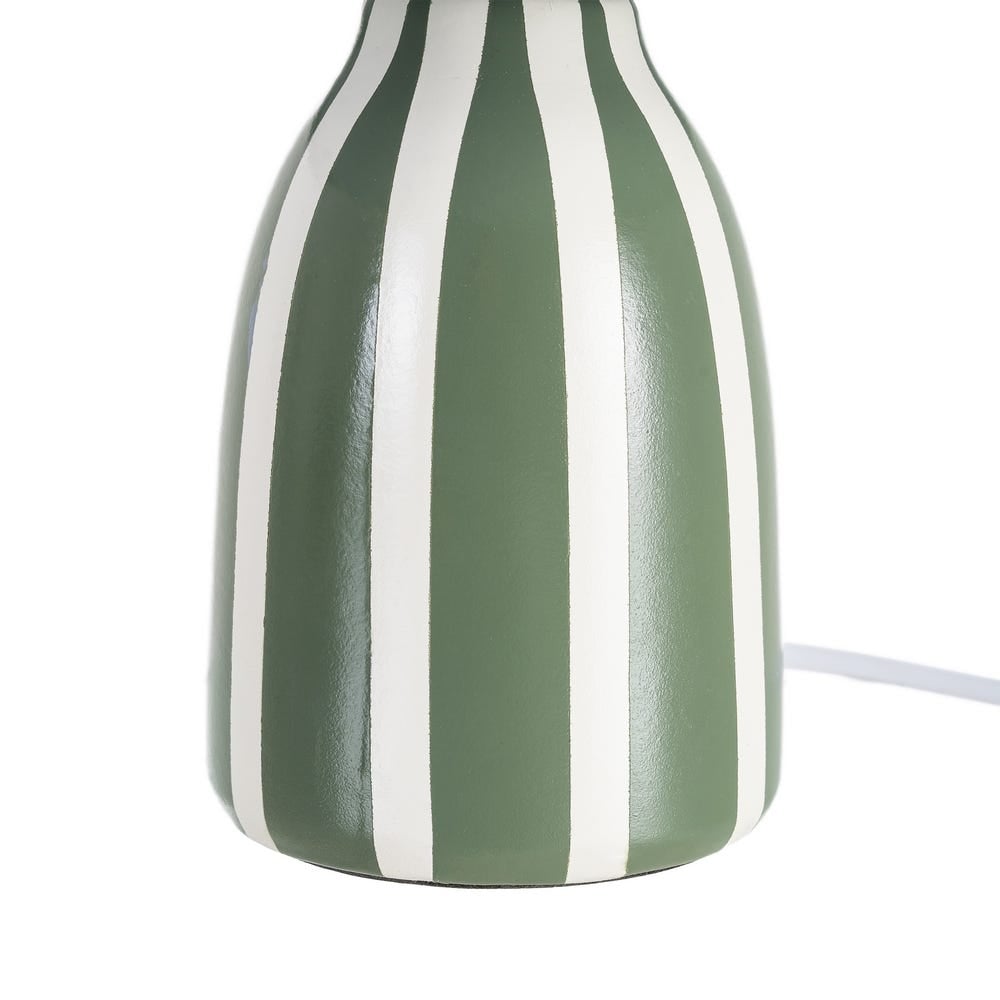 Baza cu finisaj lucios și dungi verticale în alb oferă un aer grafic și ordonat, în timp ce tonul verde natural al ceramicii aduce calm și căldură vizuală. Abajurul textil conic difuzează lumina uniform, creând o atmosferă liniștită și elegantă, potrivită pentru dormitoare, birouri sau colțuri de lectură.