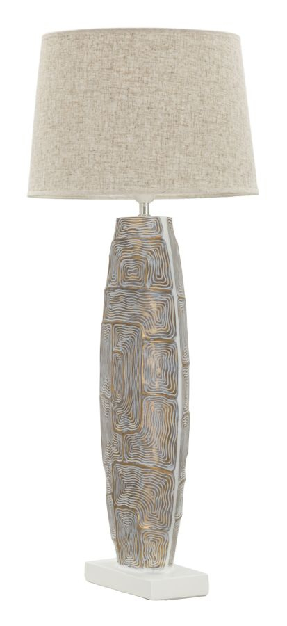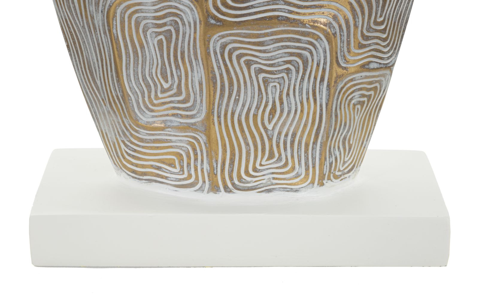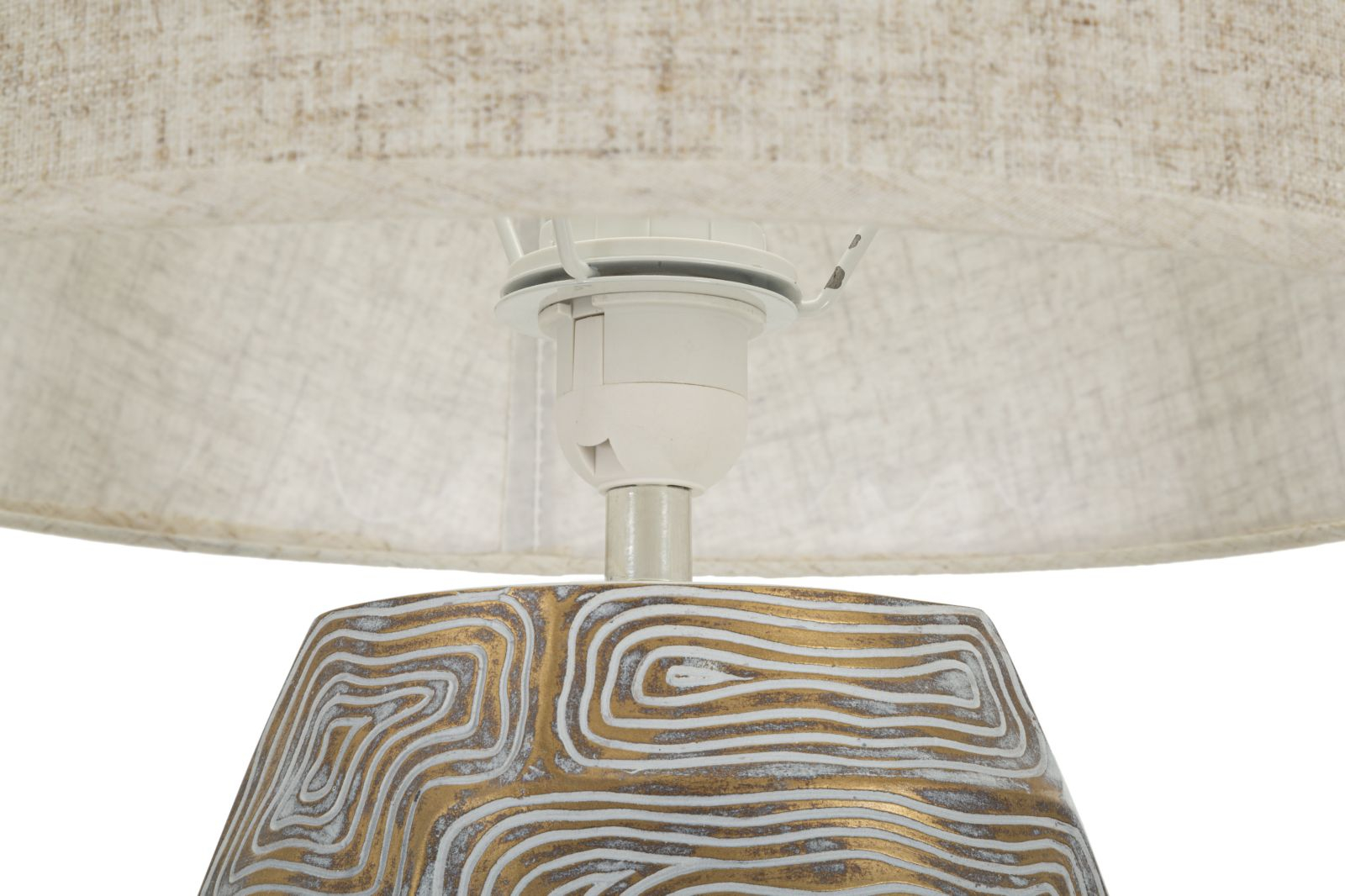 Aceasta lampa este decorată cu un model geometric complex în nuanțe de alb și auriu. Acest model creează un efect vizual interesant, atrăgând privirile și adăugând o notă de modernitate și sofisticare. Finisajul auriu oferă un strop de lux, în timp ce detaliile albe adaugă luminozitate și claritate designului.