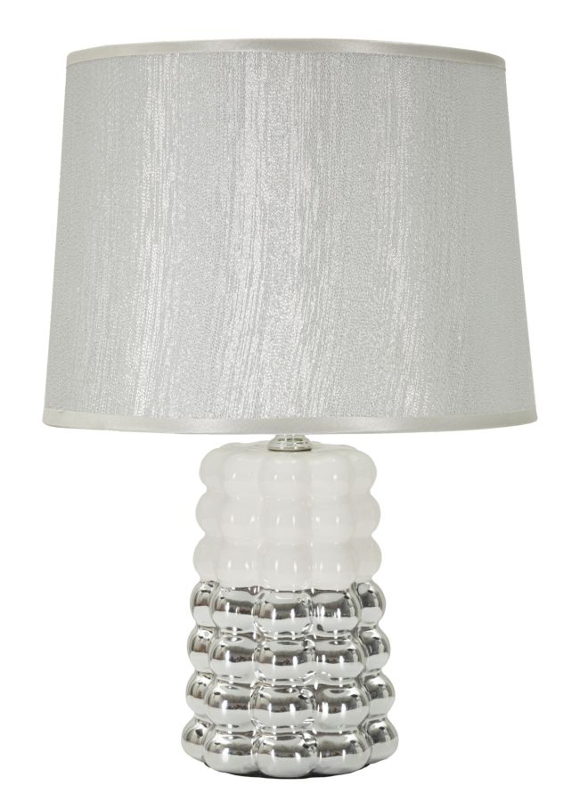 Veioze din ceramică finisate în alb și argintiu, cu un design modern și texturat care adaugă personalitate și luminozitate camerei. Abajurul textil cu aspect satinat oferă o lumină difuză, plăcută și relaxantă, ideală pentru momente de seară.