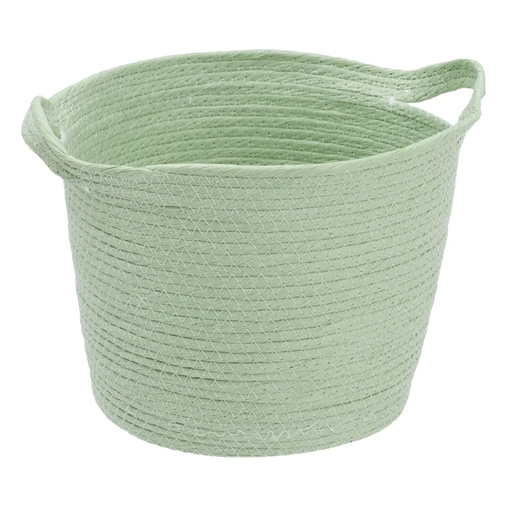 Trio de coșuri din sfoară de hârtie verde deschis cu mânere. Dimensiuni: 26x26x33 cm, 23x23x28 cm, 20x20x23 cm. Oferă o soluție de depozitare eco-friendly și estetică. Aceste coșuri sustenabile, fabricate manual și importate din Spania, adaugă o notă proaspătă și naturală oricărui spațiu. Cum le puteti folosi? ... cum aveti nevoie. De exemplu: Folosiți coșul mare pentru reviste în living, cel mediu pentru produse de îngrijire în baie și cel mic pentru accesorii de birou. Aranjați-le pe rafturi sau în dulapuri pentru a adăuga un accent de culoare verde și o organizare eficientă în casă.