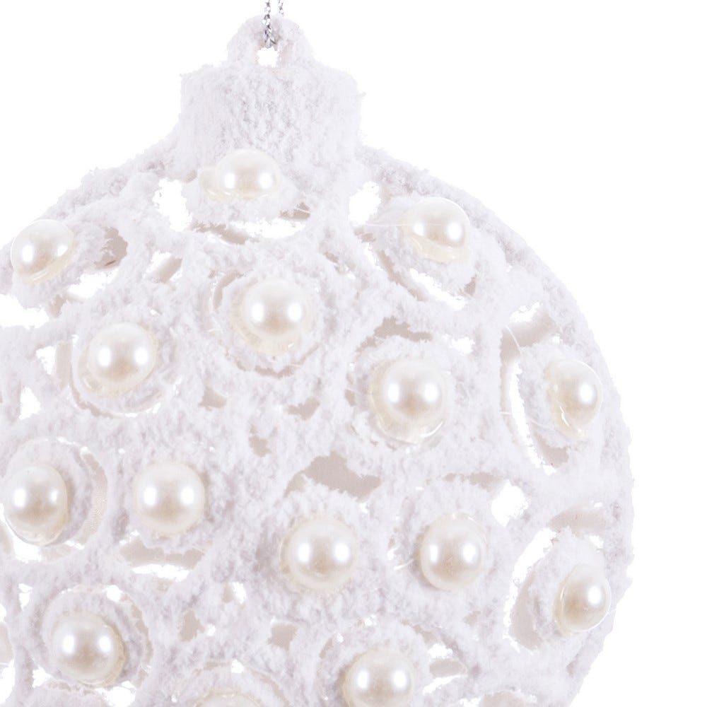 Globurile sunt acoperite cu un model filigranat care amintește de dantelă, în interiorul căruia sunt inserate perle decorative lucioase. Acest detaliu le conferă o eleganță aparte, potrivită pentru braduri albe, argintii sau tematice în stil clasic. Structura ușoară și agățătoarea argintie permit o fixare ușoară și sigură pe crengi de orice dimensiune.