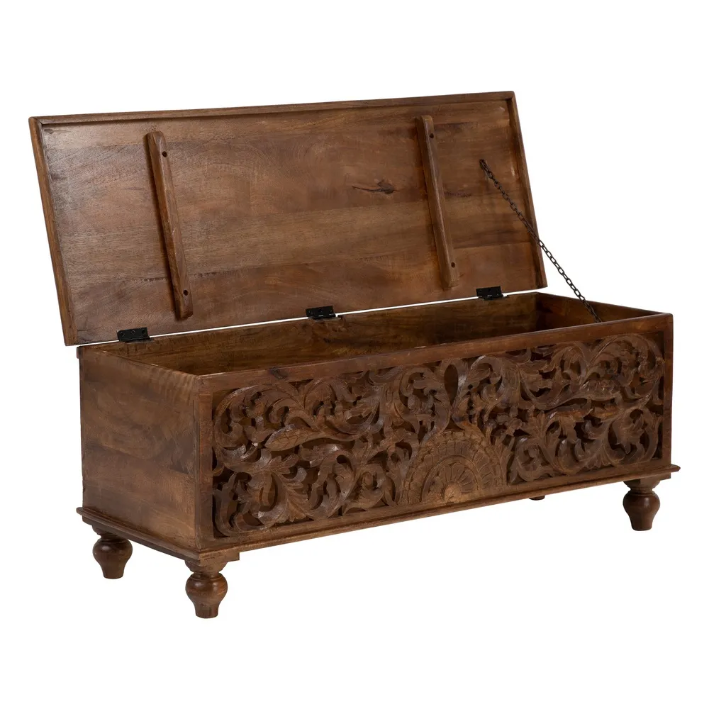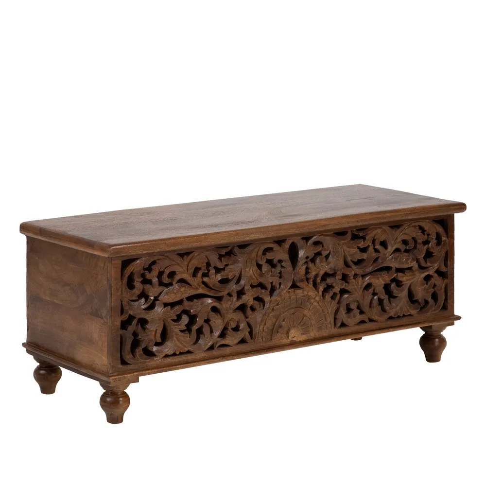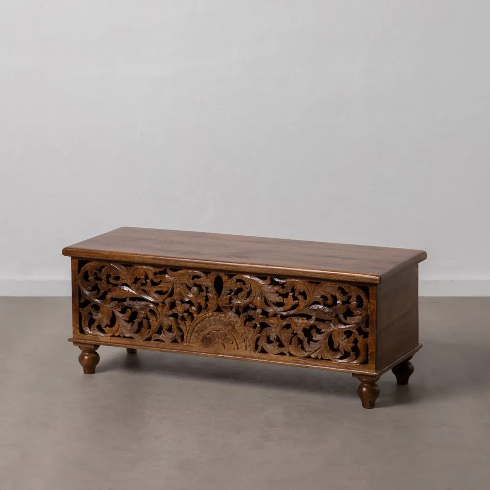 Acest cufăr-banchetă sculptat din lemn de mango lacuit, măsurând 117 cm lățime, 46 cm adâncime și 45,50 cm înălțime, este o piesă de mobilier versatilă și elegantă. Modelul vintage din lemn masiv de mango cu finisaj lacuit oferă durabilitate și strălucire. Fața decorată cu un model floral sculptat în relief adaugă un element de artizanat și rafinament. Importat de CreativDeco, acest cufăr spaniol combină funcționalitatea cu estetica, fiind perfect pentru spații care necesită soluții de depozitare stilate. Cufere-banchetă sunt apreciate pentru dualitatea lor, oferind atât loc de șezut, cât și spațiu de depozitare.
