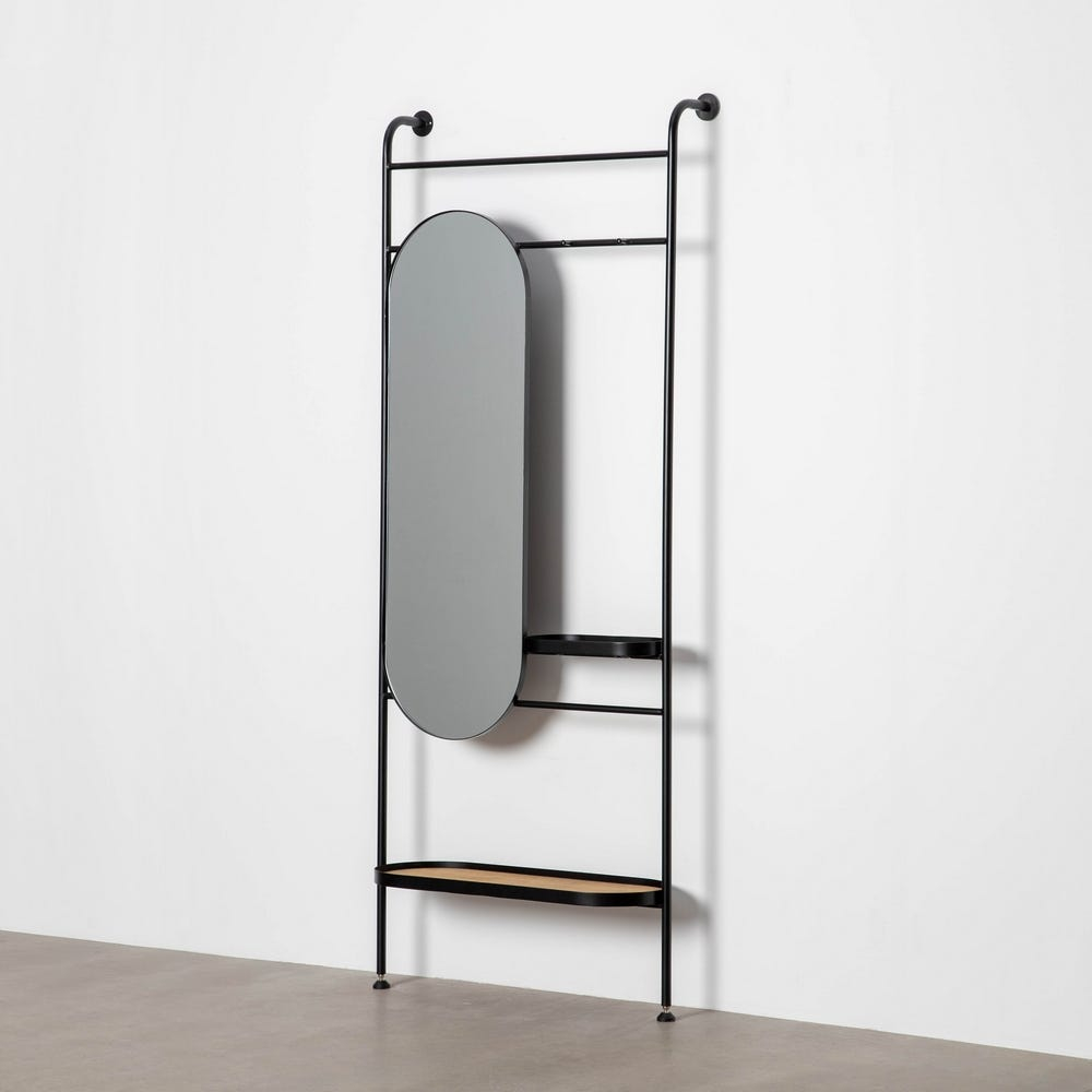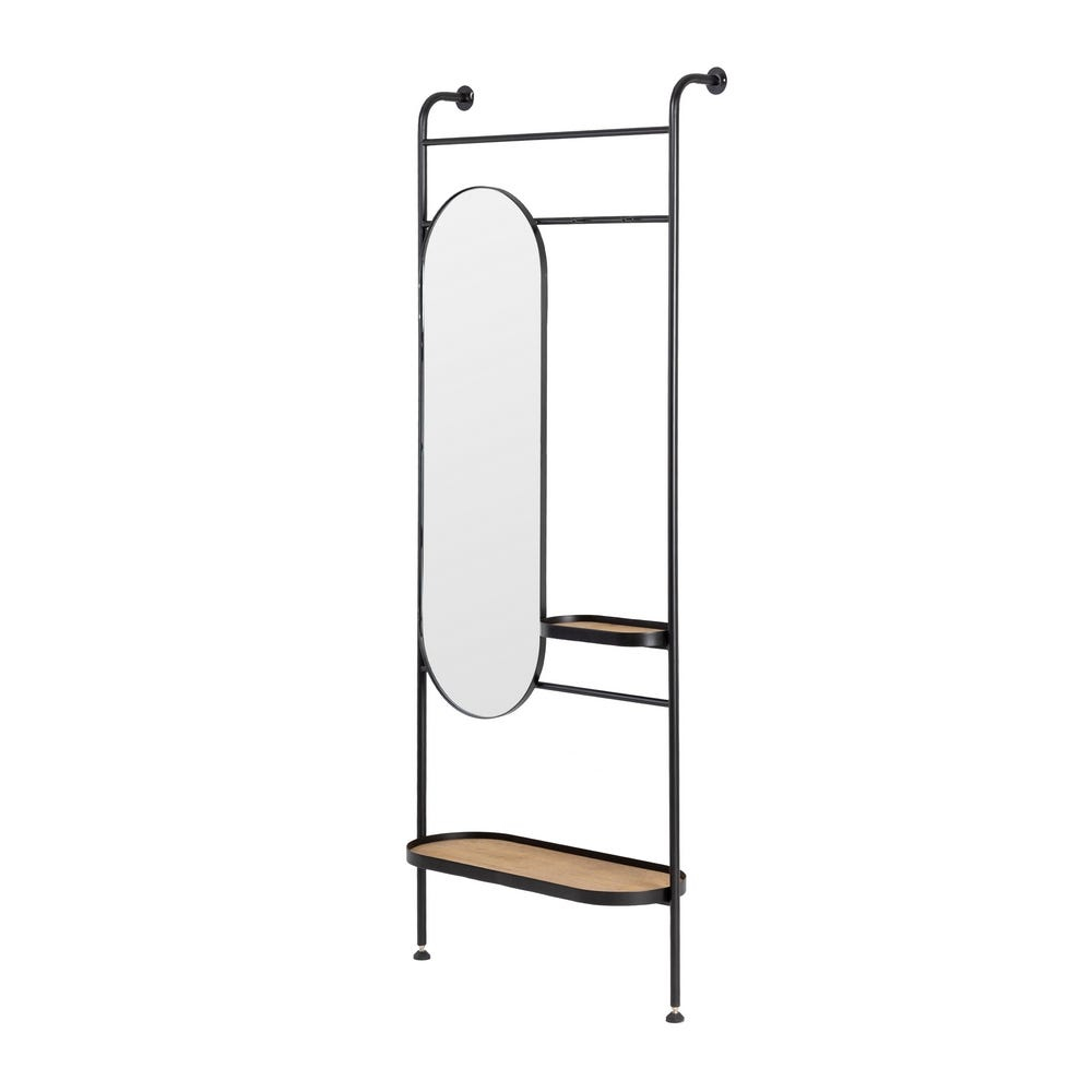 Cuier cu oglindă verticală și rafturi, realizat din lemn de cauciuc cu finisaj natural și structură din metal negru, ideal pentru holuri moderne și spații de intrare bine organizate.