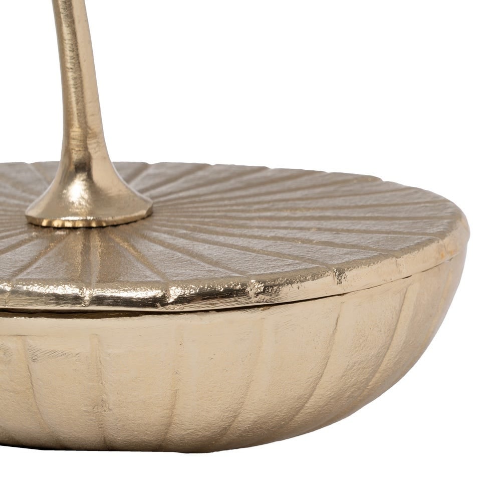 Cu o siluetă joasă și un mâner înalt, această cutie decorativă din metal auriu adaugă un accent glam discret și păstrează la îndemână micile obiecte pe care vrei să le ascunzi elegant.