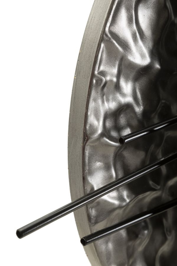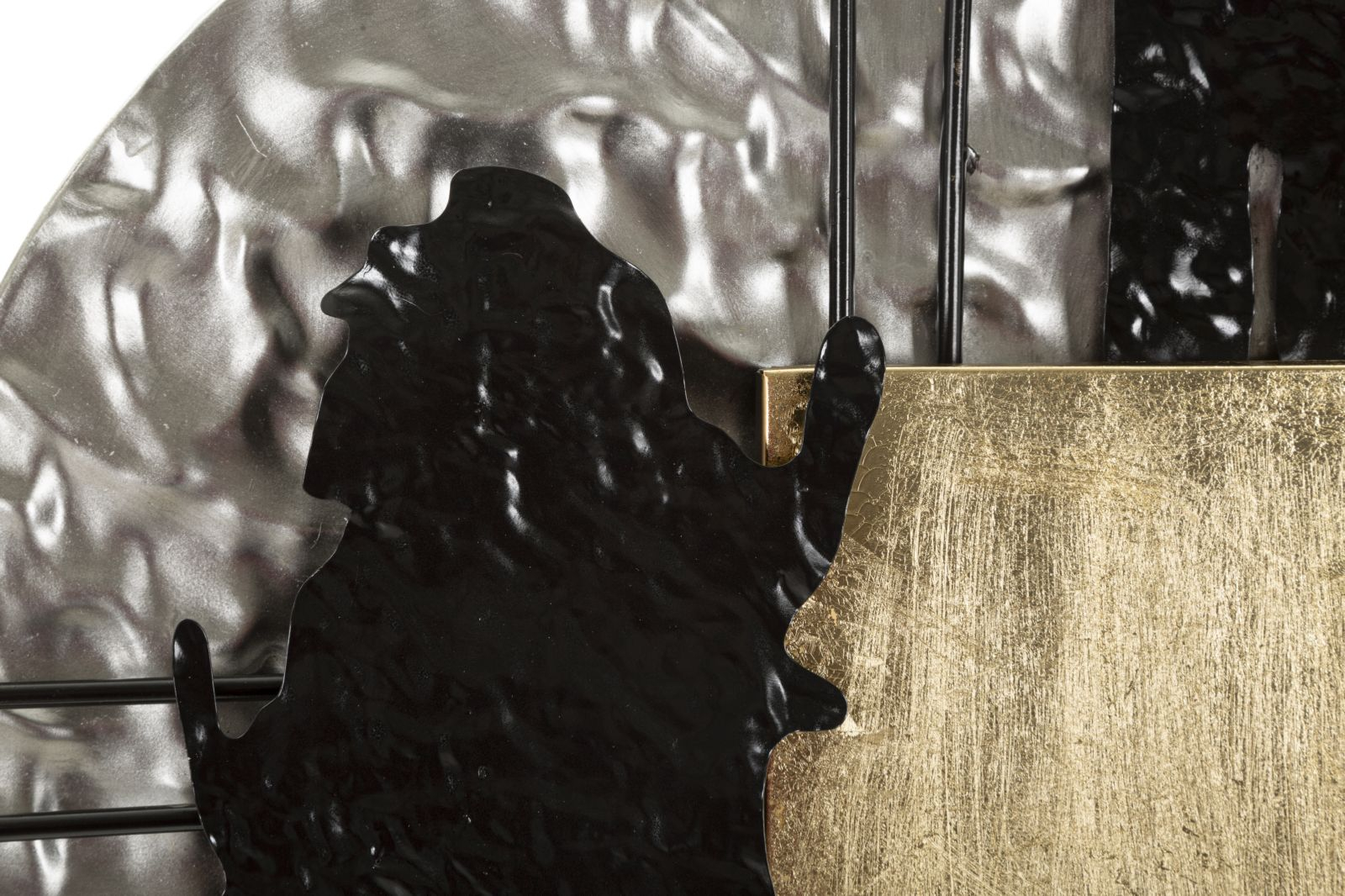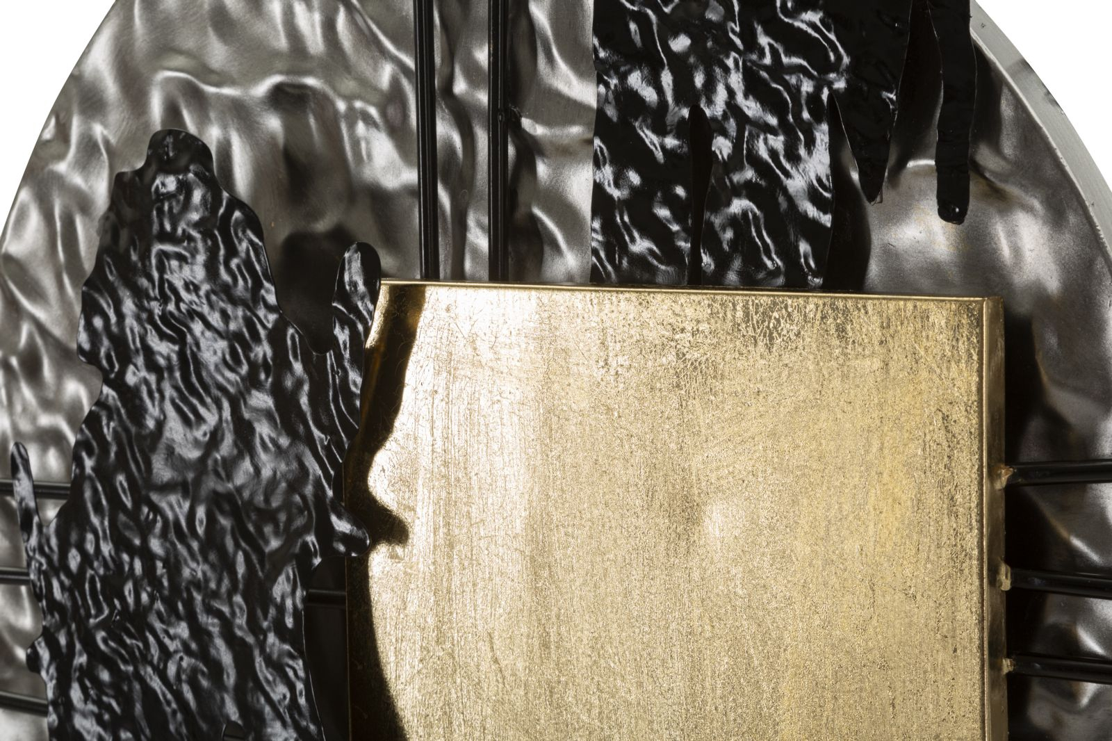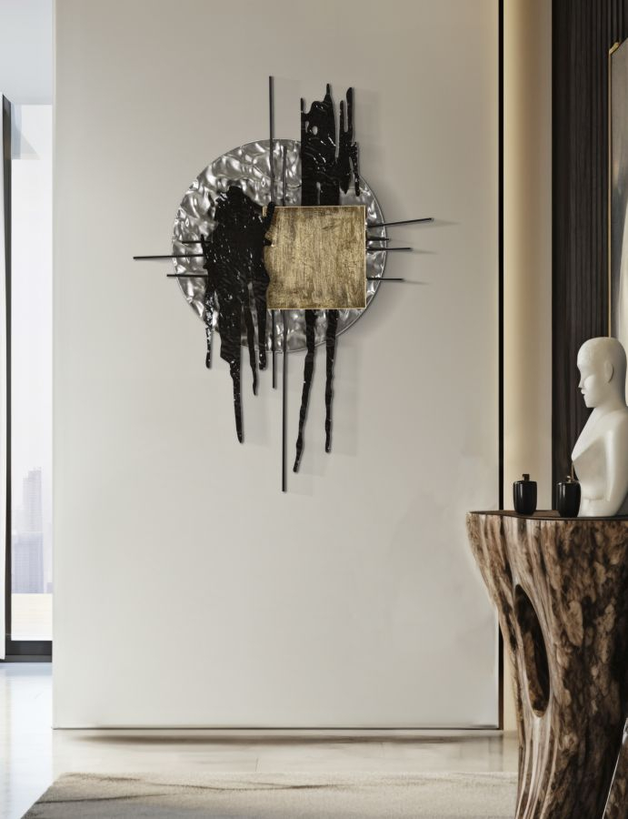 Panoul de perete Cripton A este o piesă decorativă modernă, realizată din metal finisat în nuanțe contrastante de auriu, negru și argintiu. Formele geometrice se îmbină cu linii verticale și texturi organice, creând un joc vizual spectaculos care aduce dinamism și rafinament oricărui spațiu.