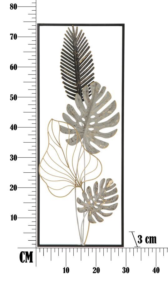 Această decorațiune metalică impresionează prin designul său elegant, combinând frunze de palmier și detalii fine de auriu, care reflectă lumina și adaugă un strop de rafinament oricărui spațiu. Cu o înălțime de 74 cm și o lățime de 28.5 cm, piesa se remarcă prin structura sa verticală și aspectul aerisit, fiind ideală pentru a adăuga o notă de naturalețe și lux în orice încăpere. Nuanțele de gri și auriu permit integrarea ușoară în diverse decoruri, oferind o doză de căldură și eleganță. Perfectă pentru livinguri sau holuri, această decorațiune îmbunătățește atmosfera și aduce un plus de stil și personalitate decorului.