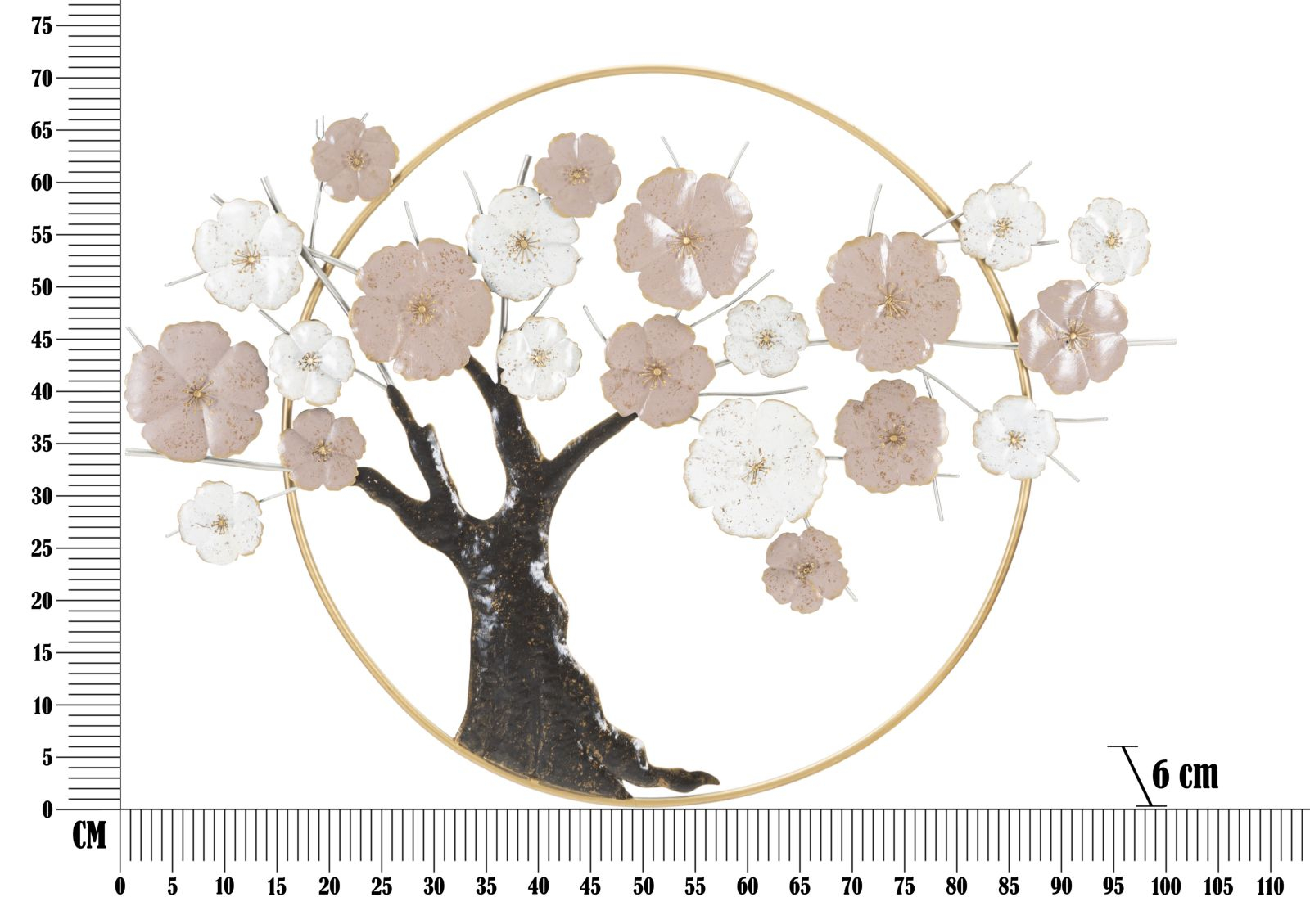 Această decorațiune de perete, cu dimensiunile de 101 cm lățime și 72 cm înălțime, este realizată din metal și prezintă un design distinctiv cu ramuri subțiri care se întind spre flori delicate. Cadrul său circular auriu încadrează splendid copacul cu aspect natural, ceea ce o face ideală pentru a aduce un suflu de natură în decorul oricărui spațiu interior. Florile, în nuanțe variate de alb și roz pal, sunt punctate cu detalii aurii care captează și reflectă lumina, adăugând o notă de strălucire și prospețime. Această piesă se potrivește perfect într-o gamă variată de interioare, de la cele clasice la cele moderne, fiind ușor de instalat și de întreținut. Îmbogățește decorul casei tale cu această piesă unică și sofisticată, perfectă pentru camera de zi, dormitor sau birou. CreativDeco importă în România acest produs doar pentru tine!