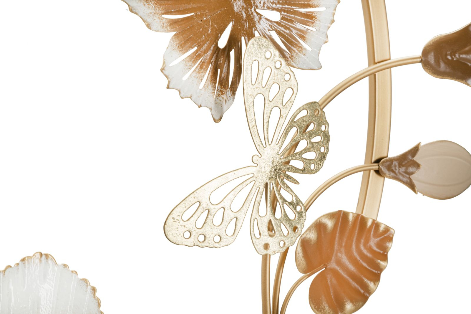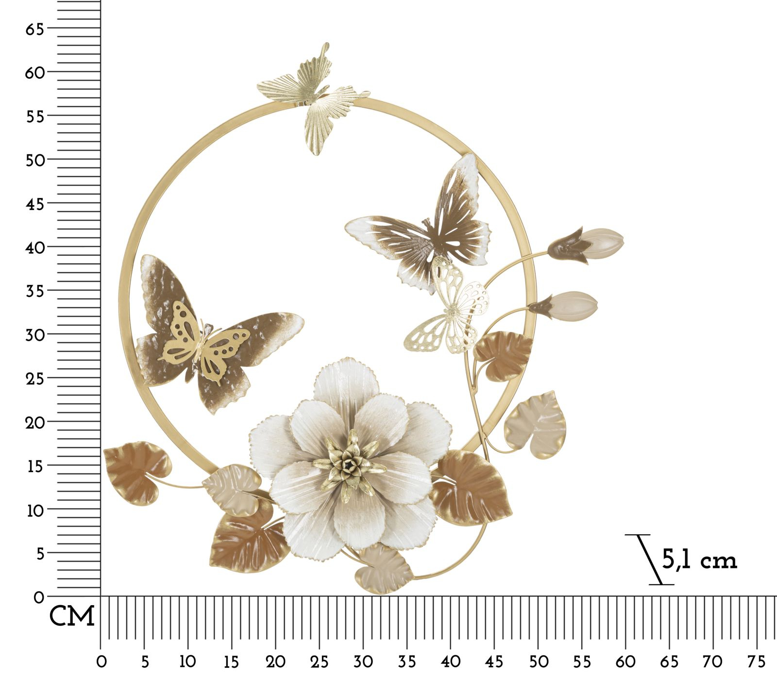 Această decorațiune de perete unică, cu un design circular, aduce frumusețea și delicatețea naturii în orice spațiu interior. Cu dimensiuni de 59 cm lățime și 64 cm înălțime, această piesă elegantă prezintă o floare mare centrală, înconjurată de fluturi și frunze sculptate, toate în nuanțe de auriu și bej. Detaliile minuțioase și finisajele strălucitoare adaugă un aspect vizual captivant, oferind un aer sofisticat și liniștit. Perfectă pentru decorarea pereților din living, dormitor sau chiar hol, această decorațiune contribuie la crearea unei atmosfere calde și primitoare, fiind ideală pentru a adăuga o notă de eleganță și frumusețe artistică oricărui interior.