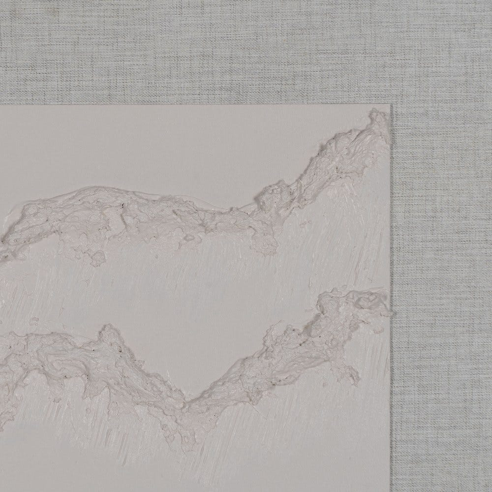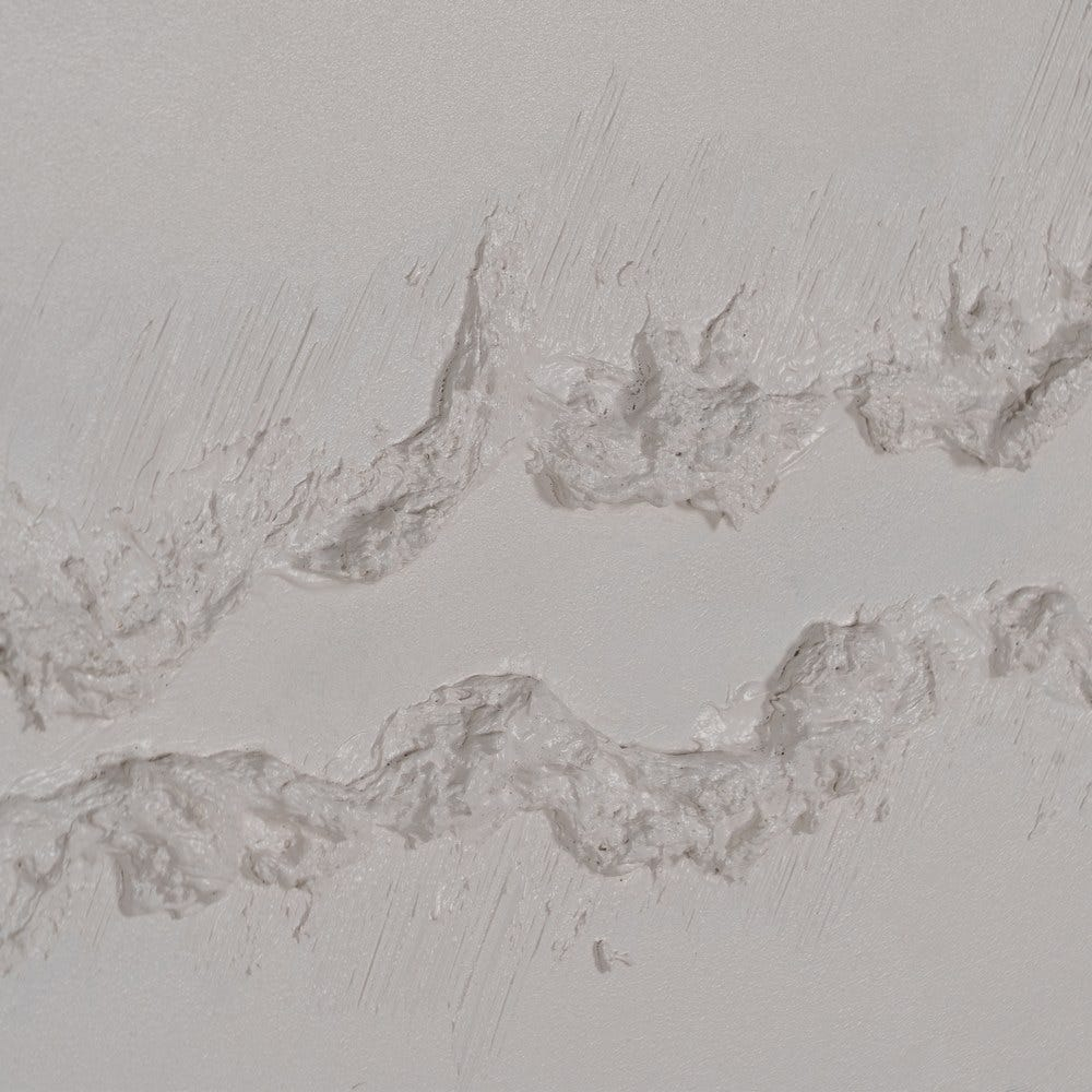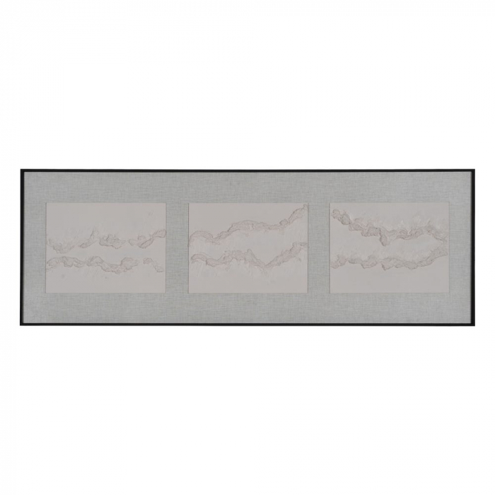Un tablou abstract cu o compoziție echilibrată și rafinată, conceput sub forma unui triptic minimalist. Cele trei segmente centrale prezintă linii fluide și forme delicate în tonuri neutre de gri și bej deschis, cu accente subtile de alb și rose auriu, sugerând o interpretare poetică a unui peisaj montan sau a unui relief văzut de sus.