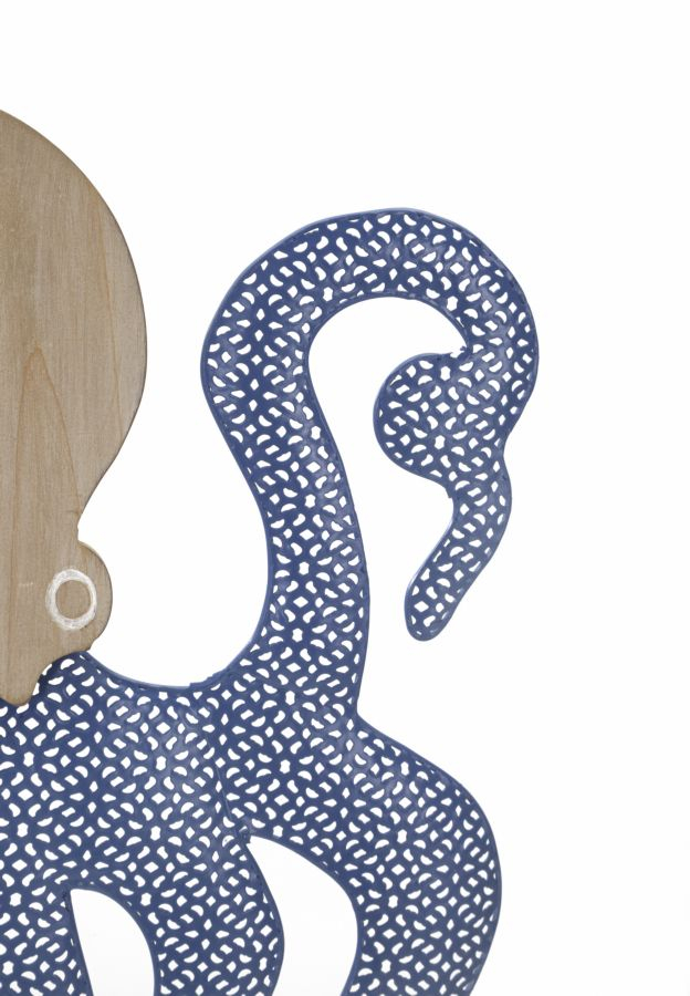Această decorațiune de perete captivantă combină lemnul cu metalul pentru a crea silueta unei caracatițe, având lățimea de 41 cm și înălțimea de 57 cm. Capul caracatiței este realizat din lemn, iar tentaculele detaliate sunt sculptate în metal albastru cu un model punctat, adăugând un efect vizual distinct. Acest element decorativ este perfect pentru a adăuga un accent marin în orice spațiu, de la birou până la camera de zi sau spațiul de joacă al copiilor. Designul său atractiv și detaliile artistice îmbogățesc orice încăpere, aducând o notă de originalitate și aventură subacvatică în decorul tău interior.