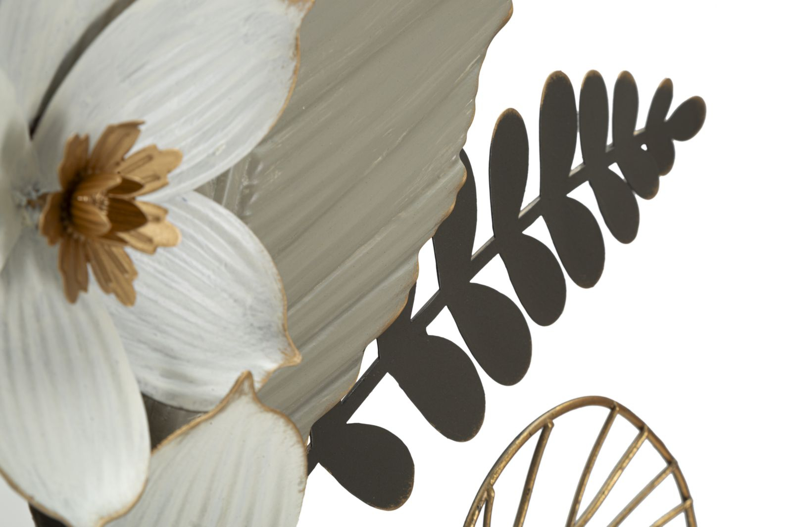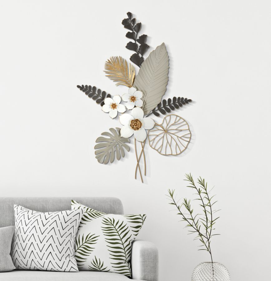 Această decorațiune de perete sofisticată îmbină frumusețea florilor albe cu diversitatea frunzelor, creând un ansamblu armonios în stil Glam. Măsurând 71 cm lățime și 97 cm înălțime, această compoziție artistică cuprinde frunze mari de diverse forme și nuanțe, de la gri pal la auriu strălucitor, precum și flori delicate cu centre aurii. Fiecare element este finisat meticulos pentru a capta și reflecta lumina, adăugând un joc de culori și texturi ce atrage privirile. Ideală pentru a aduce un element natural și rafinat în spațiile de locuit sau de lucru, această decorațiune elegantă transformă orice perete într-un punct subtil de atracție, completând decorul cu un stil distinct și modern.