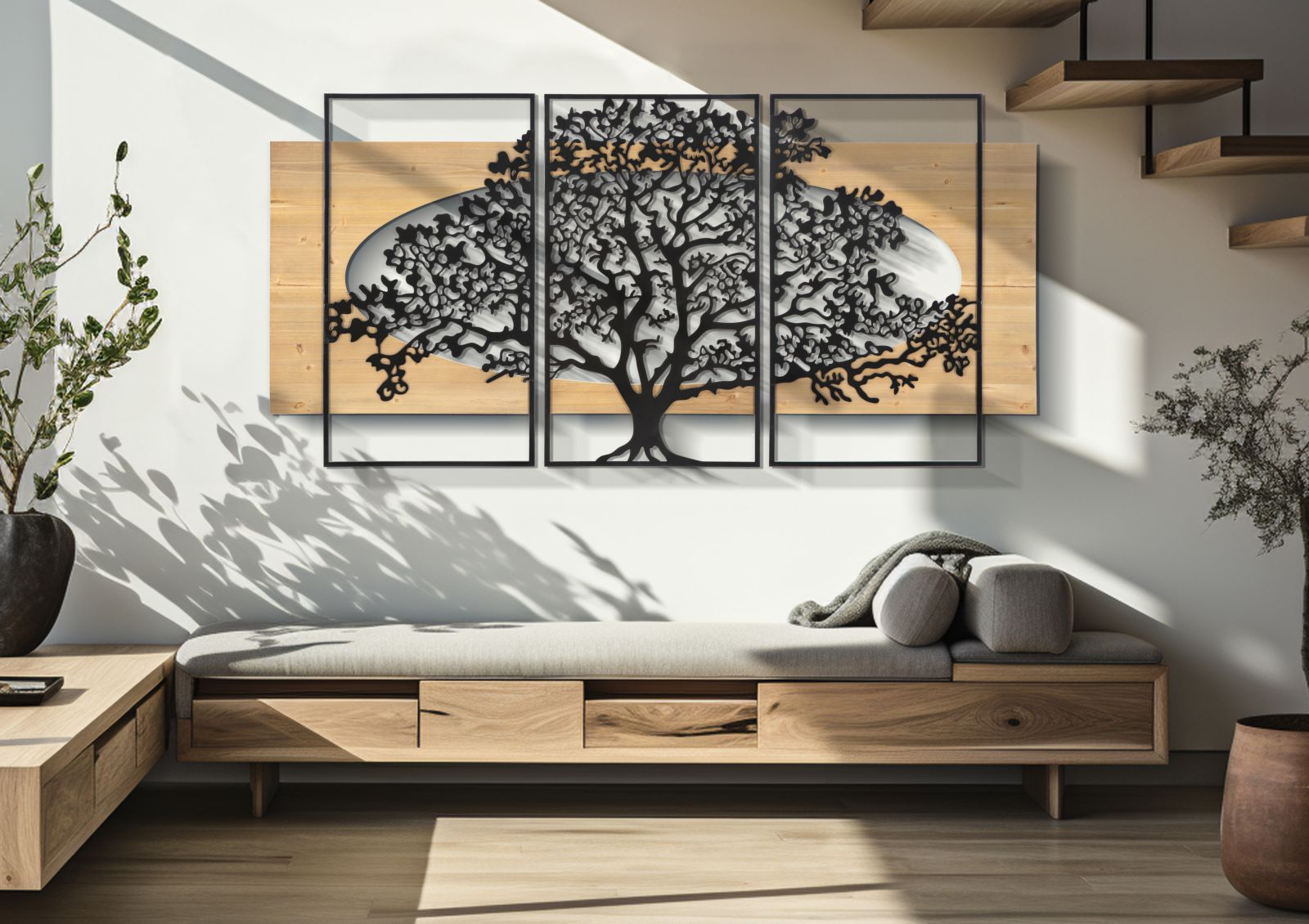 Adaugă un accent elegant inspirat de natură în spațiul tău cu acest set de trei panouri decorative, care prezintă un impresionant arbore întins pe trei panouri de metal și lemn. Ideal pentru interioare contemporane sau rustice, acest set include două panouri laterale, fiecare măsurând 63 cm lățime și 90 cm înălțime, și un panou central de 50 cm lățime și 90 cm înălțime, oferind o combinație armonioasă de lemn natural și metal negru, perfect pentru a îmbogăți orice design interior fără a fi prea încărcat. Puse împreună, panourile ajung la impresionanta dimensiune de 176 cm lățime și 90 cm înălțime. Exprimă-ți stilul personal în decorul casei tale cu produsele unicat CreativDeco.